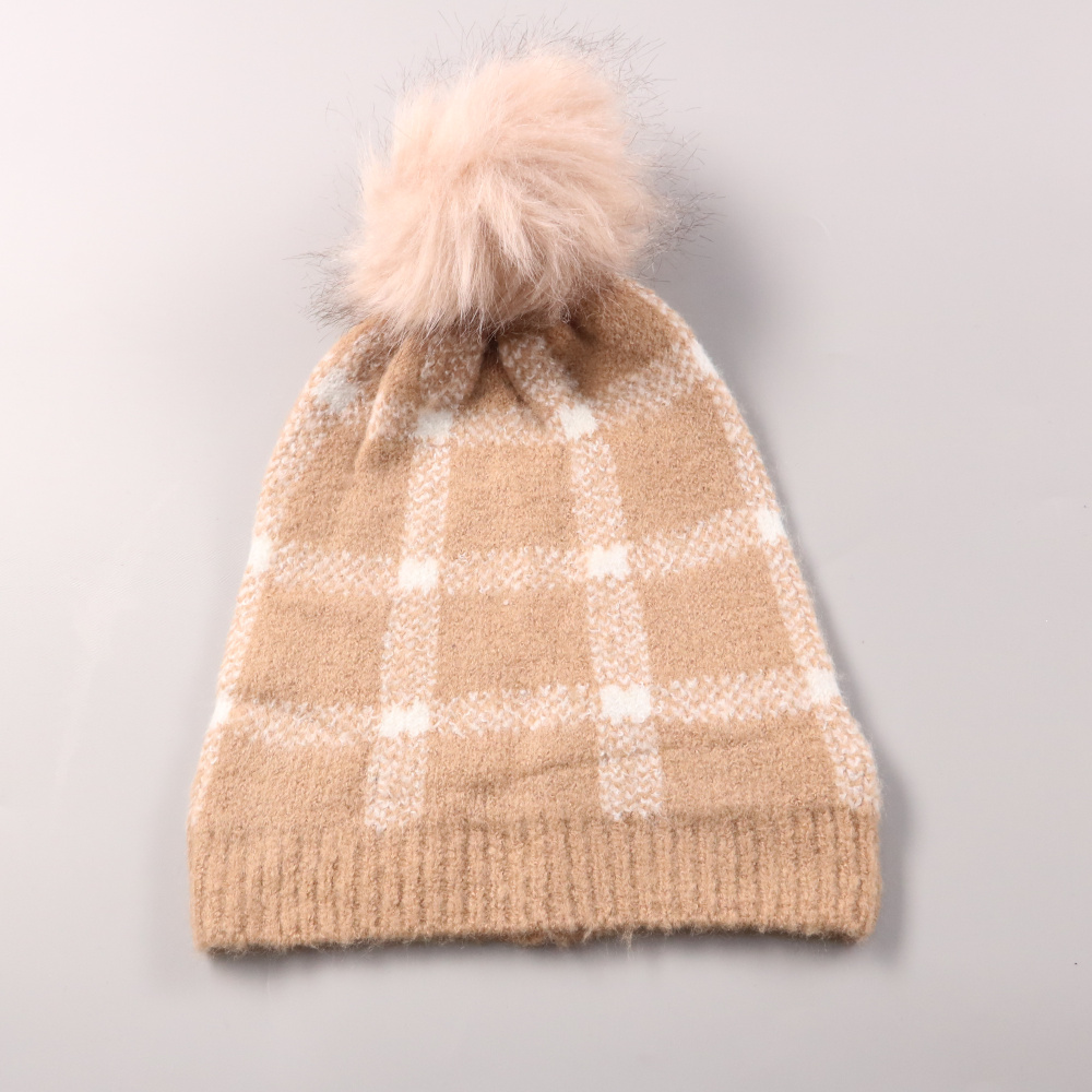 Вязаная шапка Vince Camuto в бежево-белую клетку с пушистым помпоном. Подойдёт для зимних прогулок и повседневных образов в нейтральных тонах. Мягкий акрил хорошо держит форму и прост в уходе.