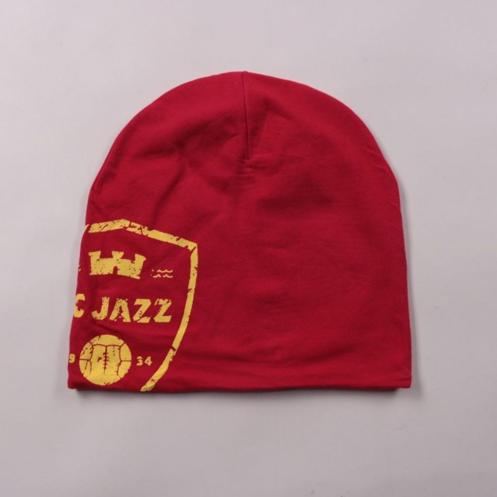 Трикотажная шапка-бини красного цвета с жёлтым принтом Jazz. Подойдёт для прогулок и повседневной носки в прохладную погоду. Ткань хорошо тянется и комфортно сидит за счёт добавления эластана.