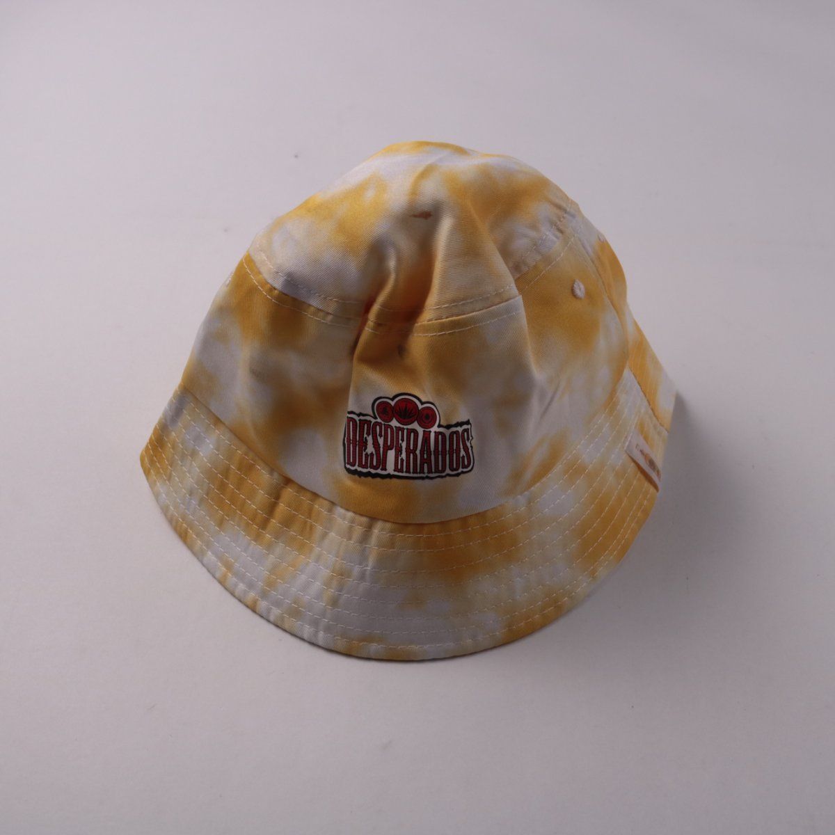 Панама Desperados в жёлто-белом tie-dye с нашивкой логотипа спереди. Подойдёт для прогулок, пляжа и фестивалей в тёплую погоду. Широкие поля помогают защищать лицо от солнца.