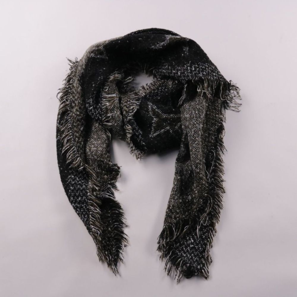 Шарф Amour чёрного цвета с принтом звёзд и бахромой по краям. Подойдёт для повседневных образов и прохладной погоды в межсезонье, легко сочетается с пальто и куртками. Большой размер позволяет носить как шарф или как накидку на плечи.