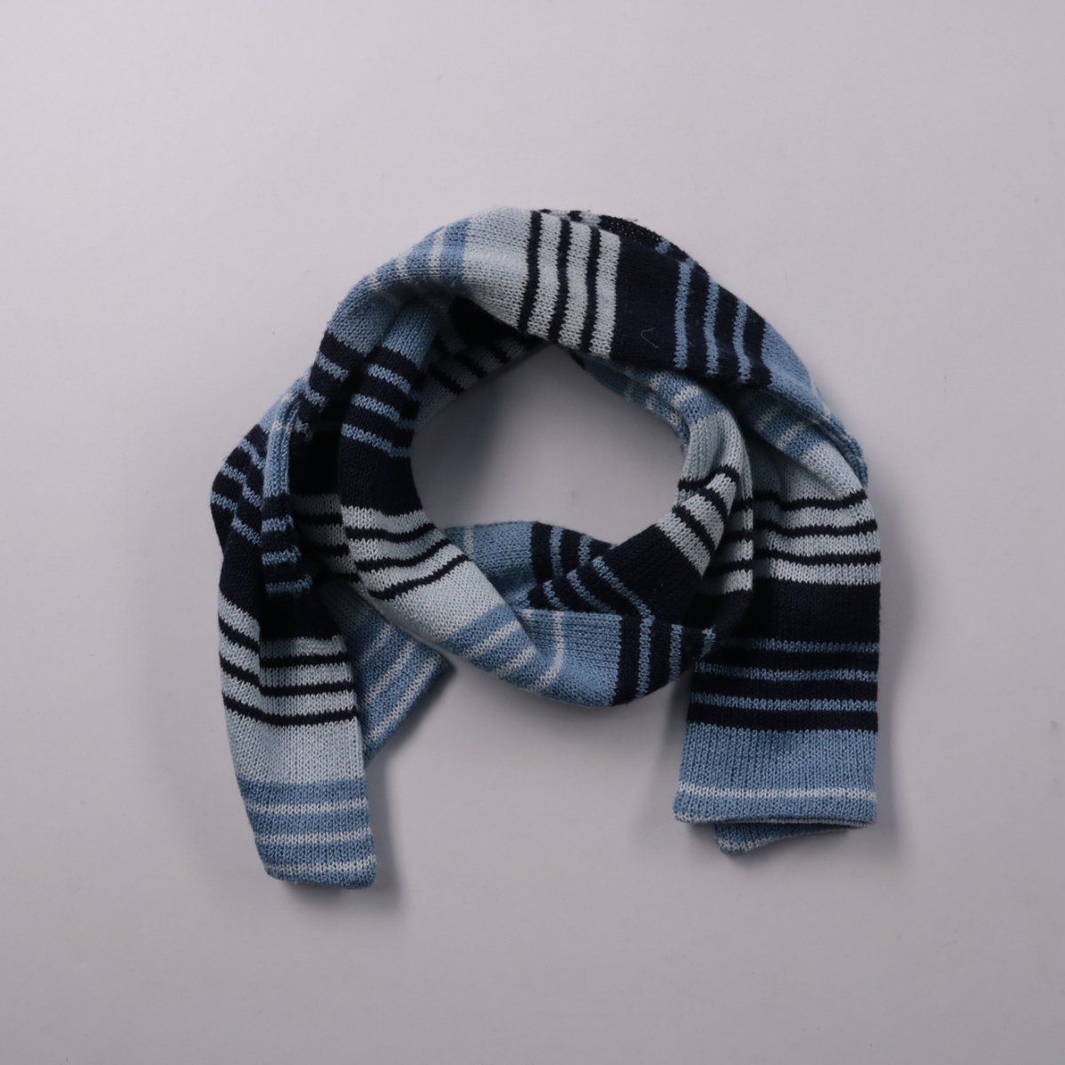 Вязаный шарф в полоску в сине-голубой гамме, подойдёт для повседневных образов в холодное время. Удобно носить с пальто или курткой на прогулку и в дорогу. Мягкая вязка хорошо удерживает тепло и легко укладывается вокруг шеи.