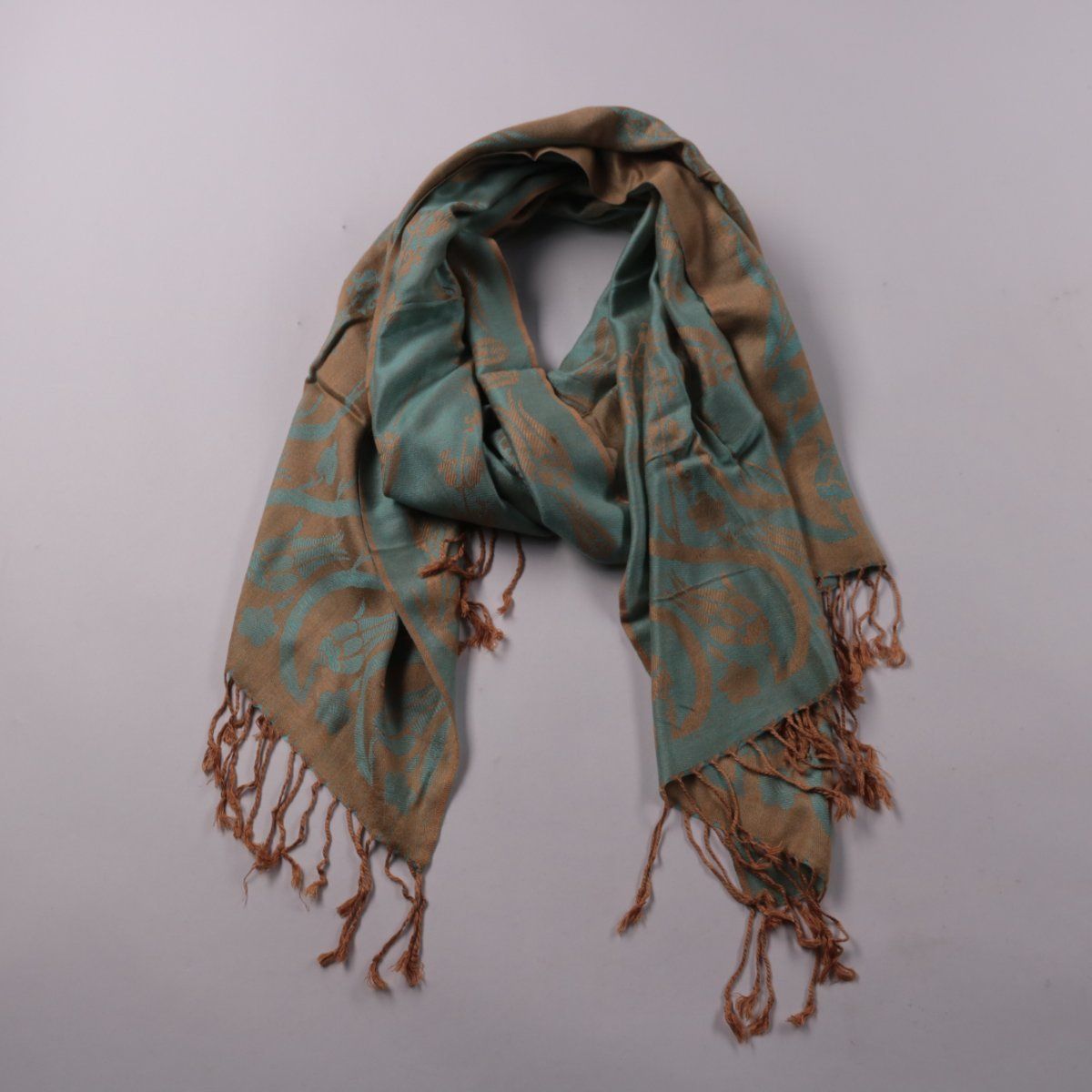 Шарф-палантин с жаккардовым узором и кисточками по краям, бренд не указан. Подойдёт для повседневных образов и как лёгкий акцент на прохладную погоду. Большой размер позволяет носить как шарф или накидывать на плечи.