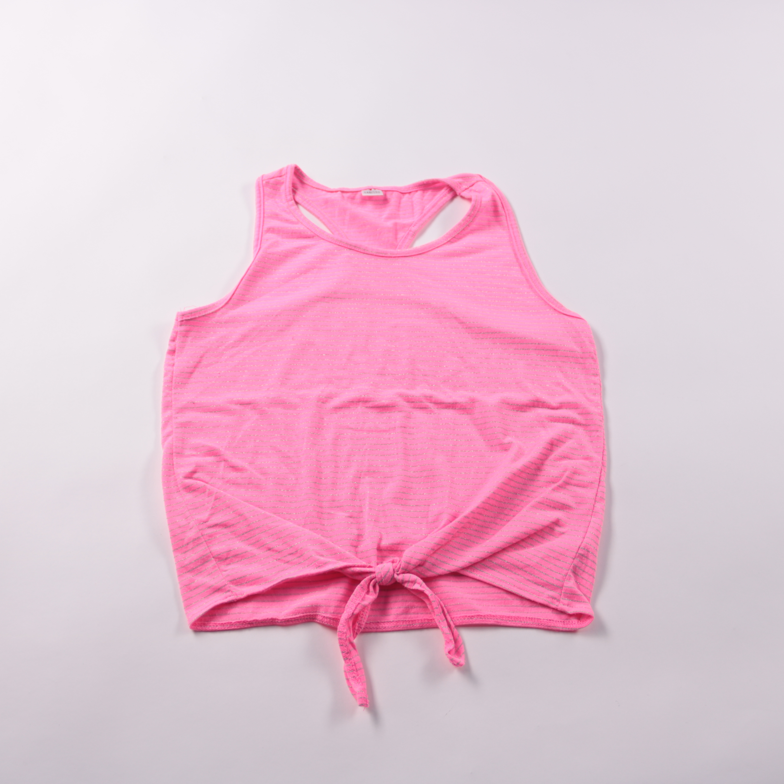 Топ Zeeman ярко-розового цвета в полоску с люрексом и завязкой спереди. Подойдёт для лета и занятий/активных прогулок, хорошо сочетается с шортами и юбками. Лёгкий синтетический материал быстро сохнет и почти не мнётся.
