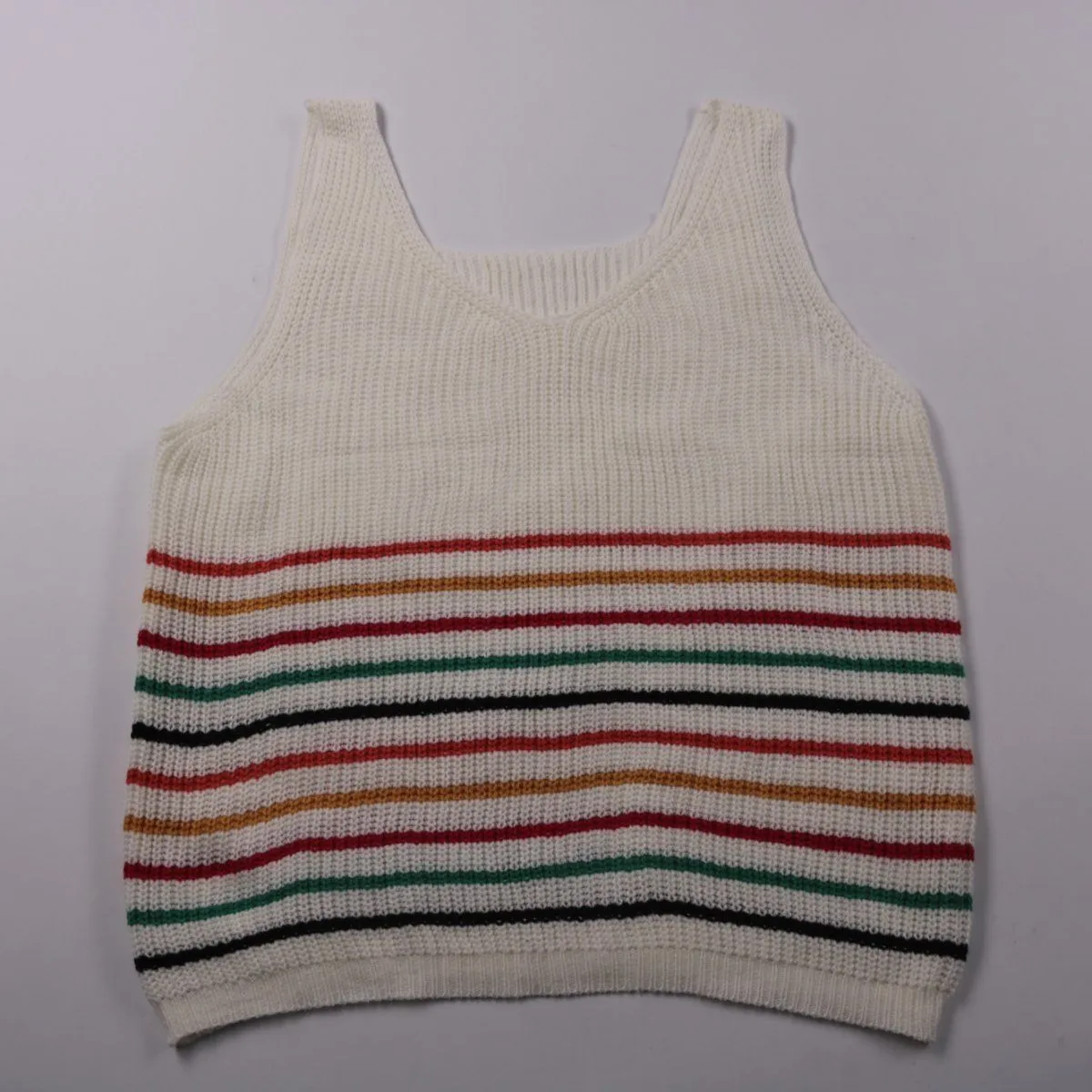 Вязаный топ в полоску, без бренда, выполнен из мягкого акрила. Подойдёт для школы и прогулок, удобно носить как самостоятельный верх или поверх футболки. Практичен тем, что не мнётся и быстро сохнет после стирки.