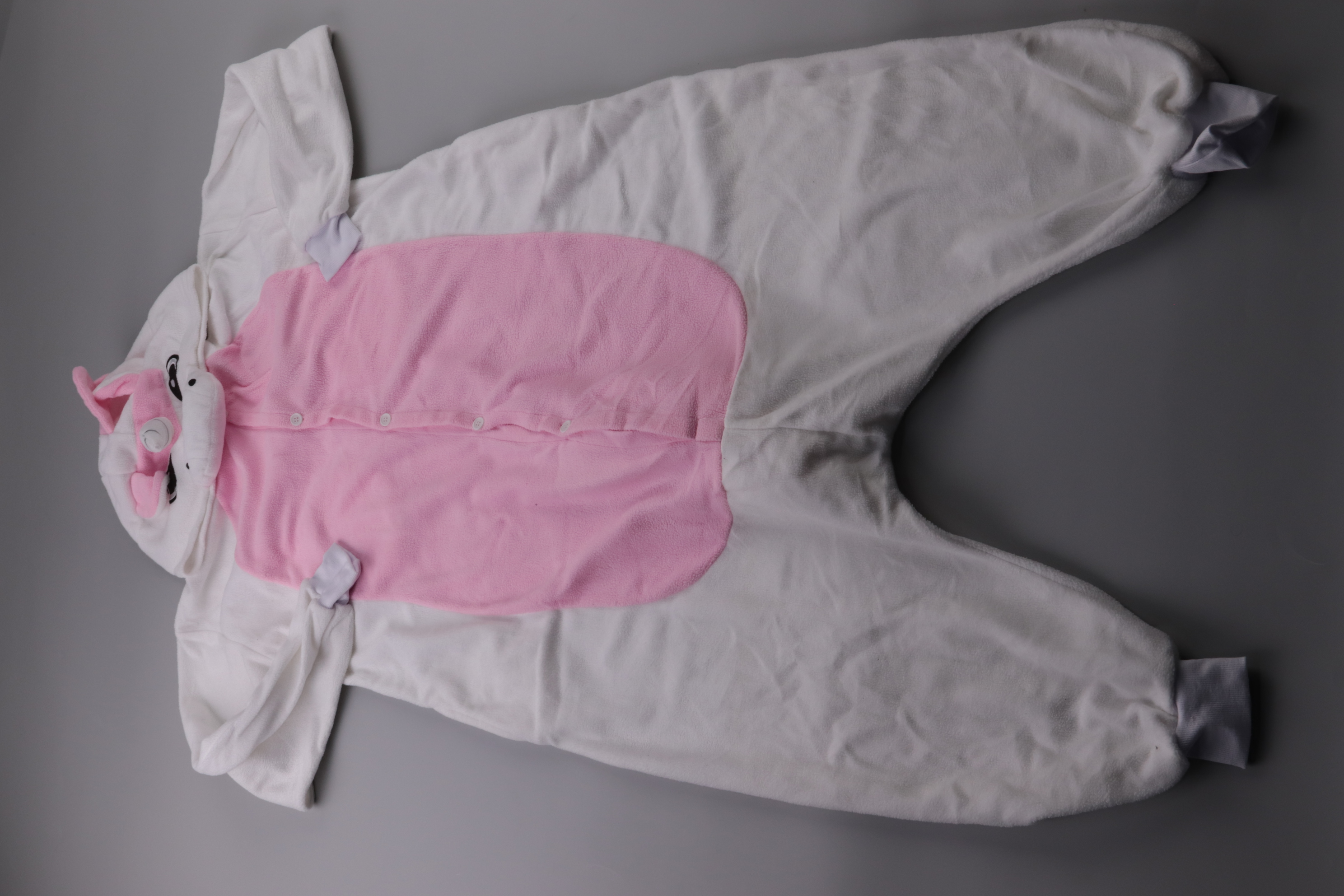 Мягкий комбинезон Made in China в бело-розовом цвете с капюшоном в виде единорога и застёжкой на пуговицы спереди. Подойдёт для дома, сна или фотосессий в прохладные дни. Практичный плюс — быстро надевается и полностью закрывает ножки, не сползает во в...