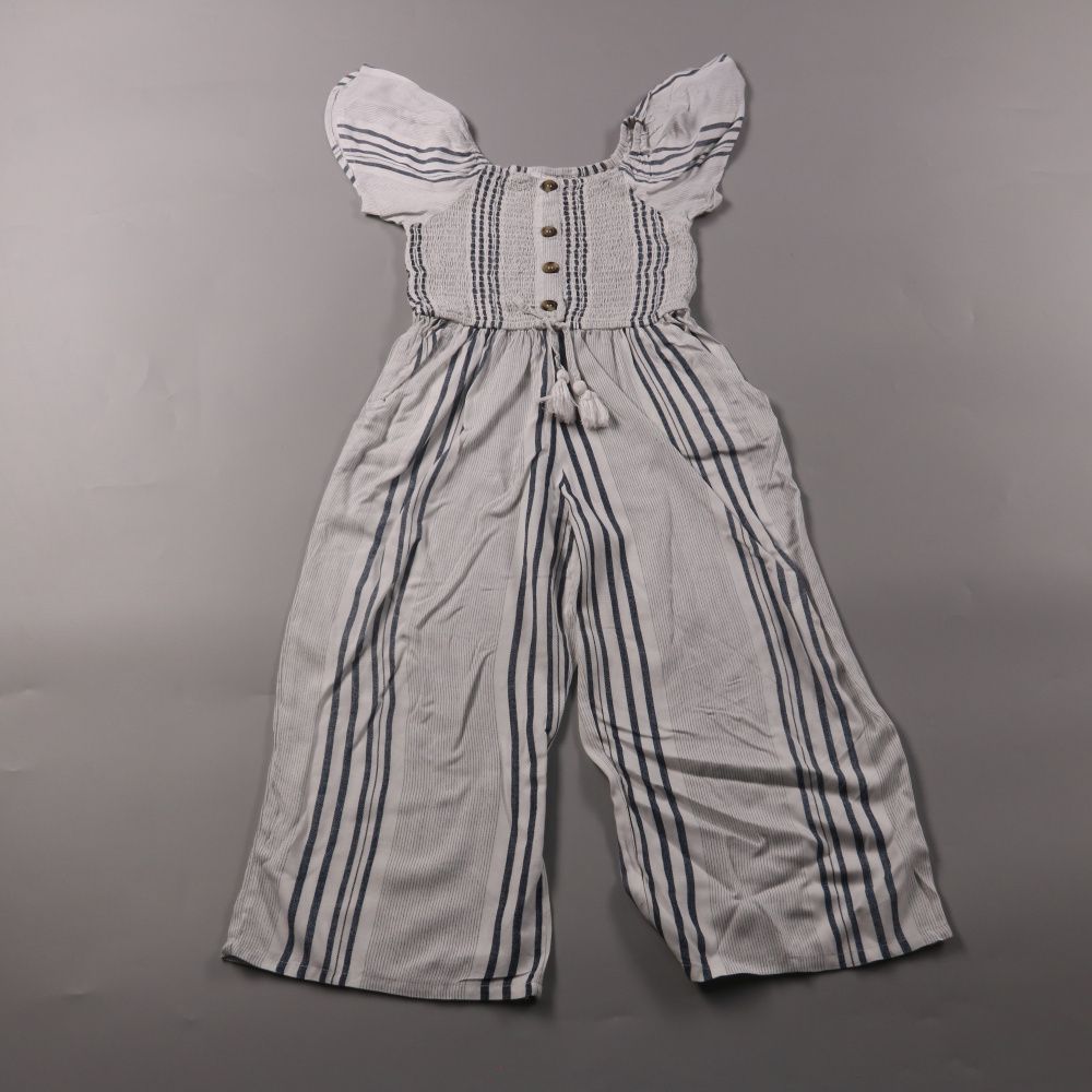 Летний комбинезон Primark Kids белого цвета в синюю полоску, с рукавами-крылышками и декоративными пуговицами спереди. Подойдёт для прогулок и поездок в тёплую погоду благодаря лёгкой ткани и свободным брючинам. Удобно надевать и снимать за счёт эласти...