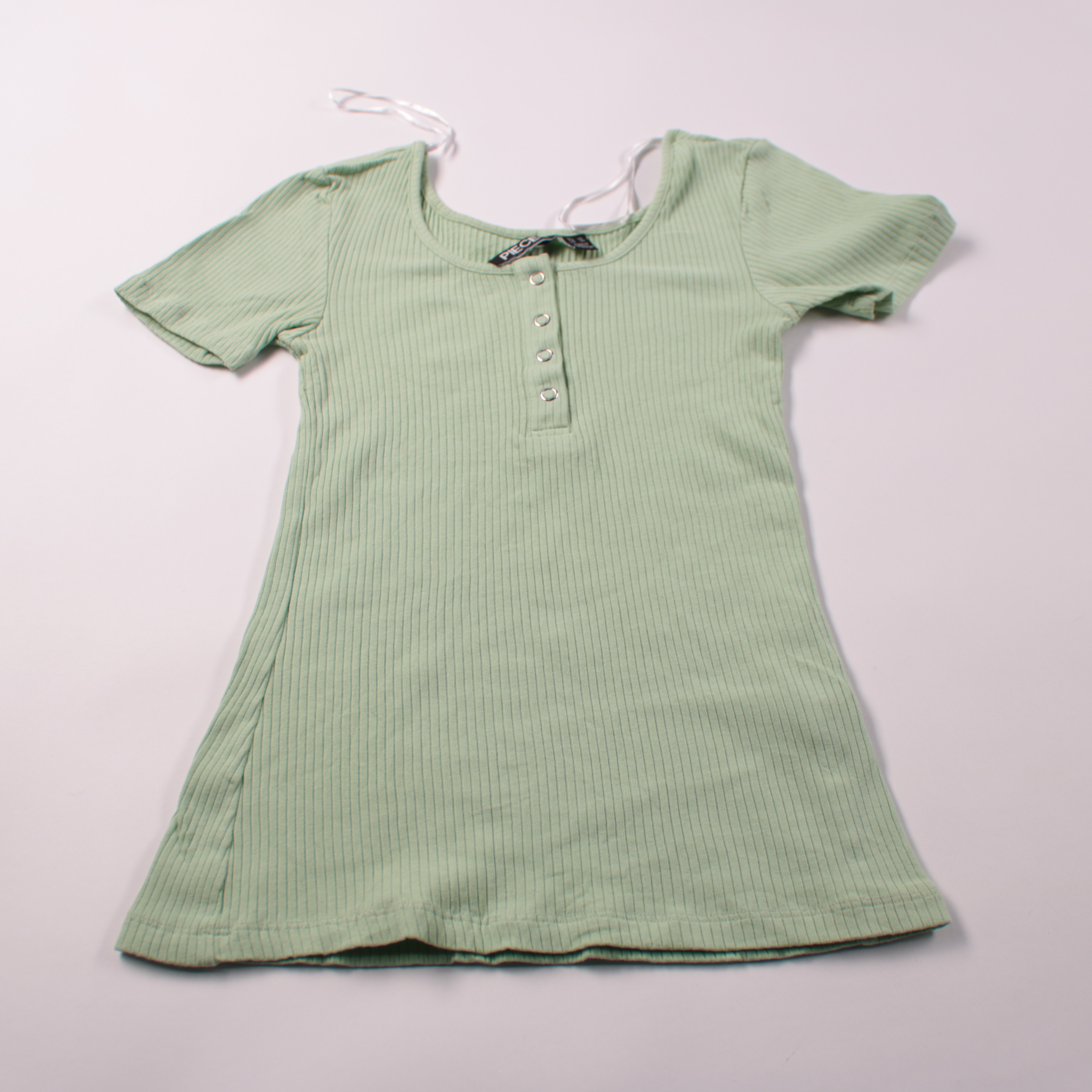 Платье Pieces мятного цвета из мягкого рубчатого трикотажа с коротким рукавом и планкой на кнопках. Подойдёт для лета и тёплой весны, удобно на каждый день и для прогулок. Тянущийся материал хорошо садится по фигуре и не сковывает движения.