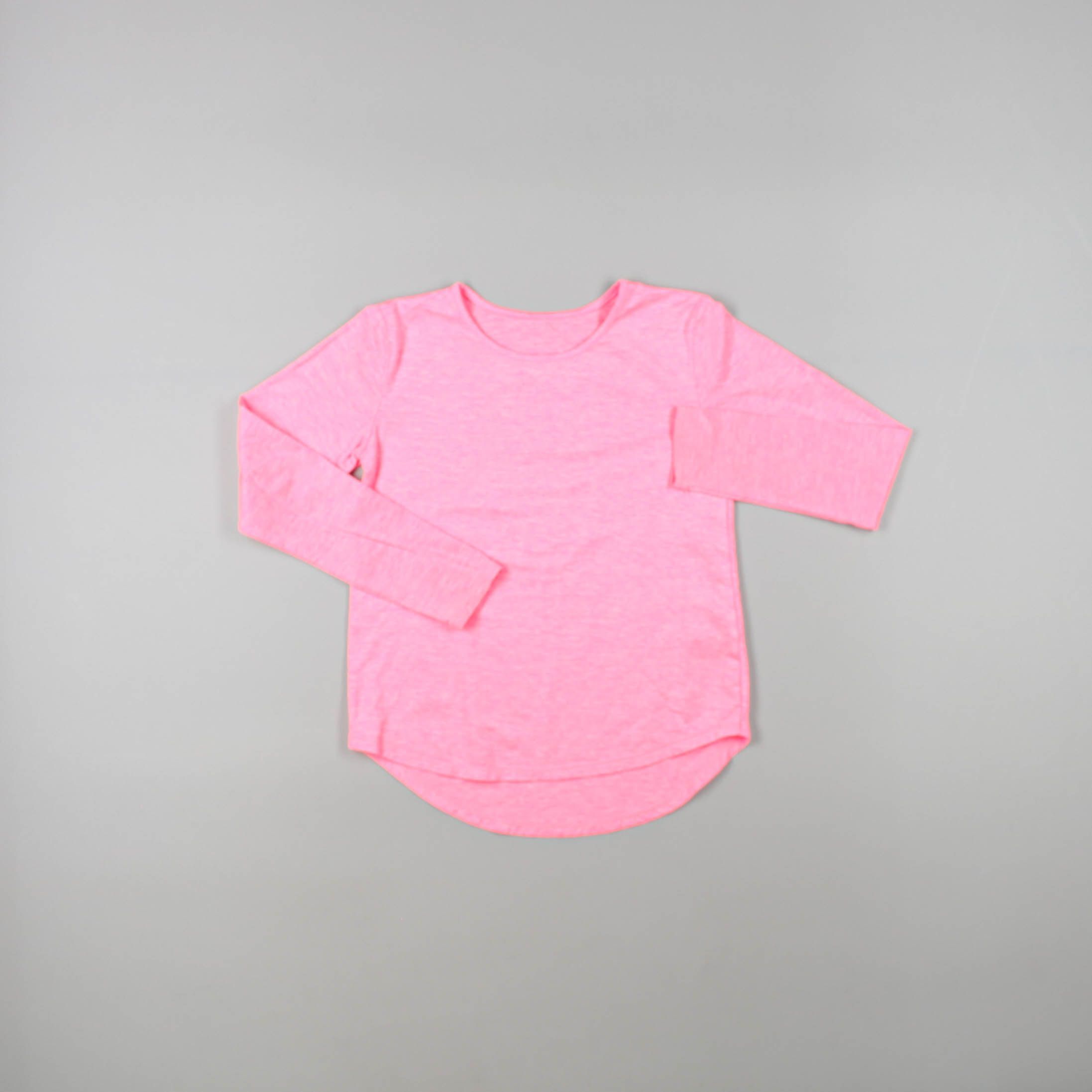 Детская кофта с длинным рукавом в ярком розовом цвете, без принта и с округлым низом. Подойдёт для школы, прогулок и как базовый слой под жилет или куртку. Лёгкая ткань комфортна в носке и не стесняет движений.