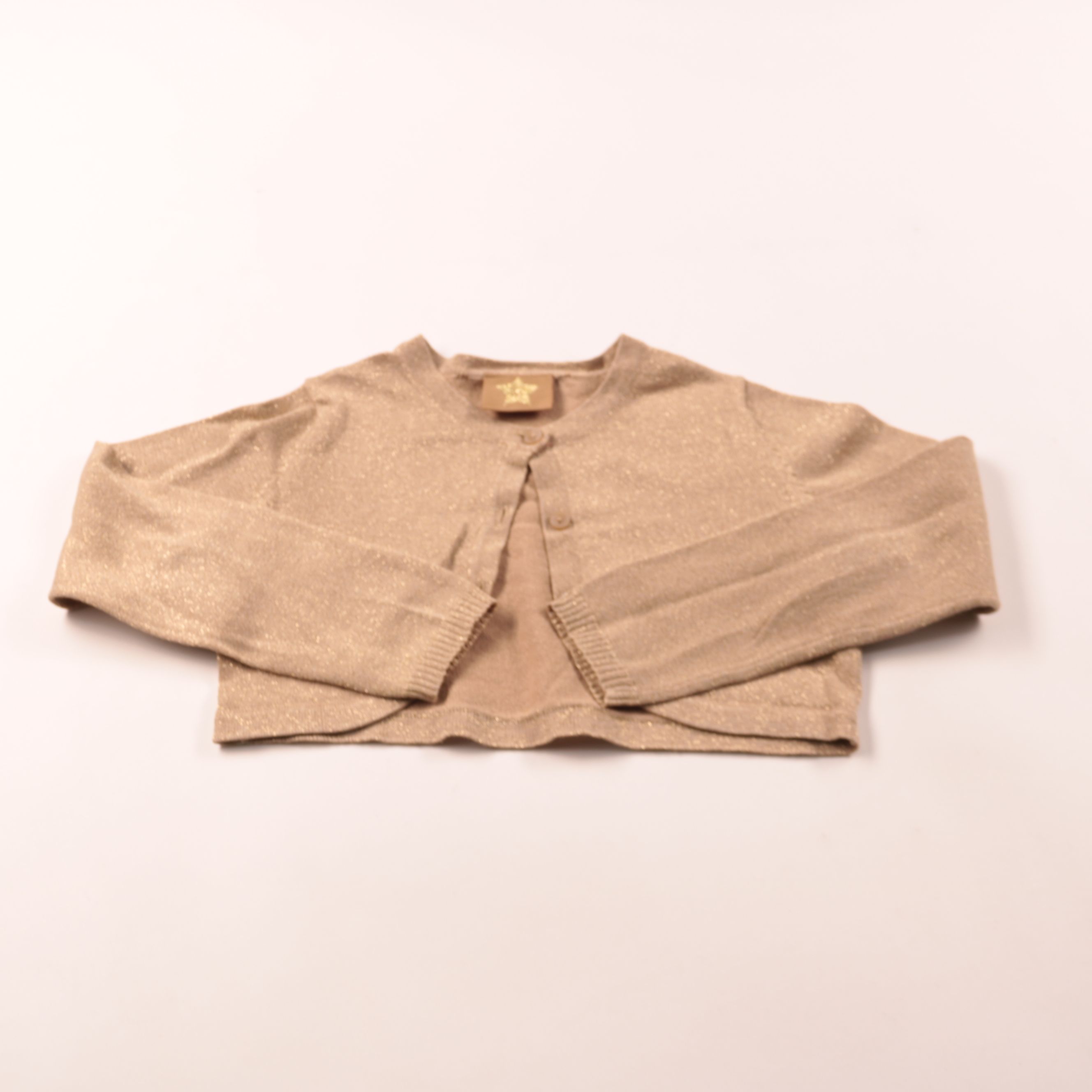 Детская кофта-болеро с люрексом, укороченная и на пуговицах. Подойдёт для праздников и на каждый день поверх платья или топа в прохладную погоду. Тонкая вязка и мягкие манжеты удобны в носке и не сковывают движения.