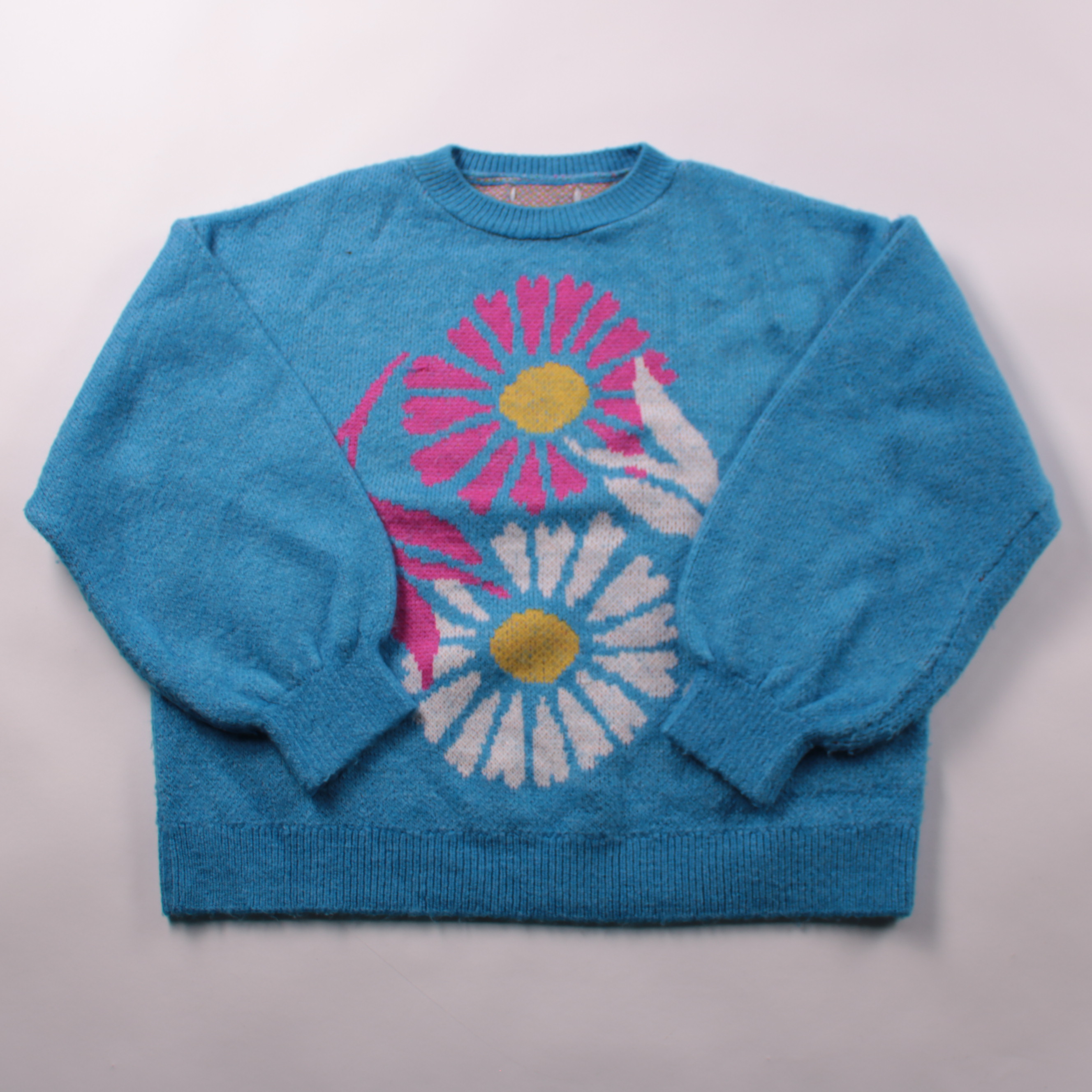 Вязаный свитер для девочки голубого цвета с ярким рисунком ромашек спереди. Подойдёт для прогулок и садика в прохладную погоду, хорошо сочетается с джинсами и леггинсами. Мягкий трикотаж и эластичные манжеты помогают комфортно носить и быстро надевать.