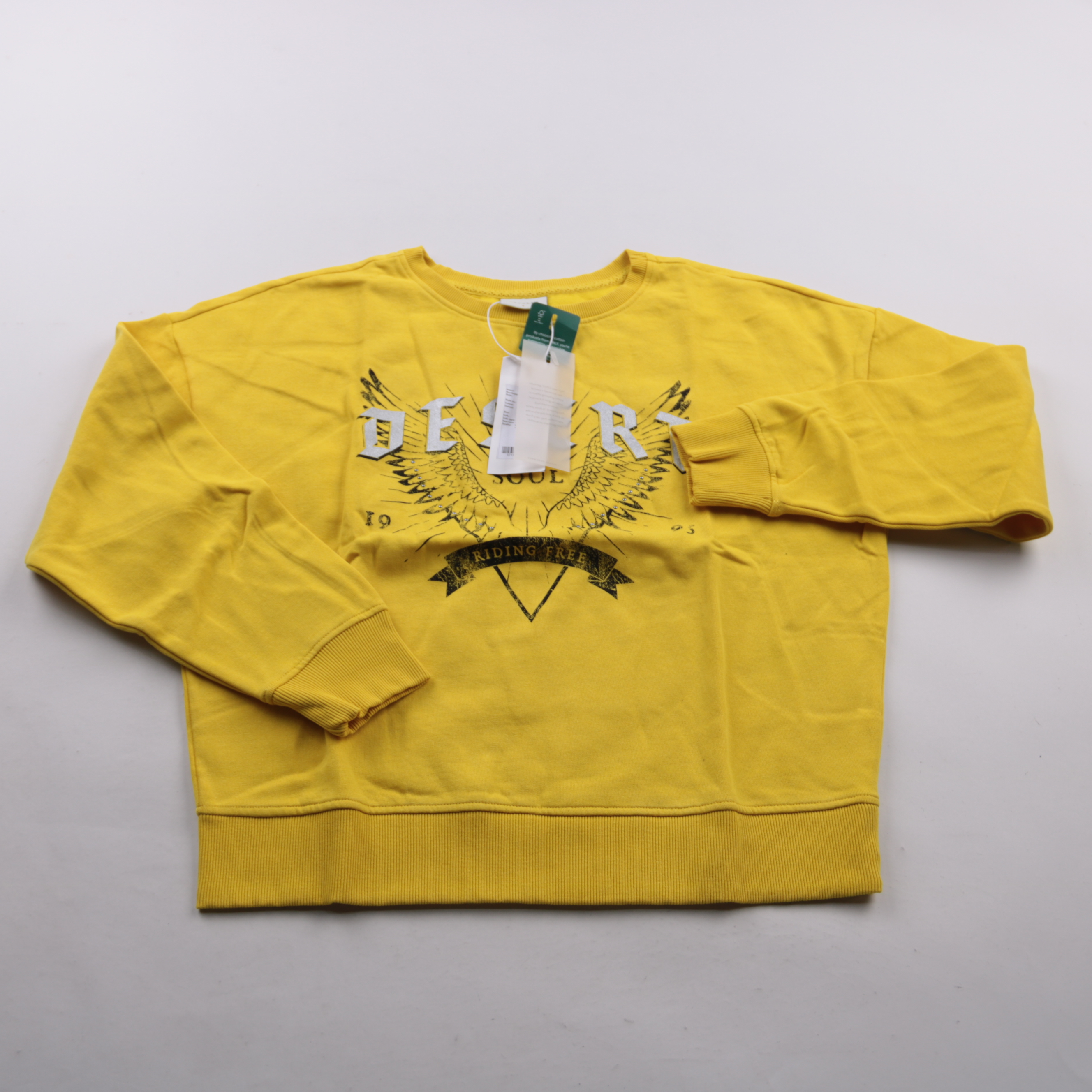Свитшот Only жёлтого цвета с принтом спереди и круглым вырезом. Подойдёт для повседневной носки в школу или на прогулки в прохладную погоду. Манжеты и широкий низ на резинке помогают вещи лучше держать форму.