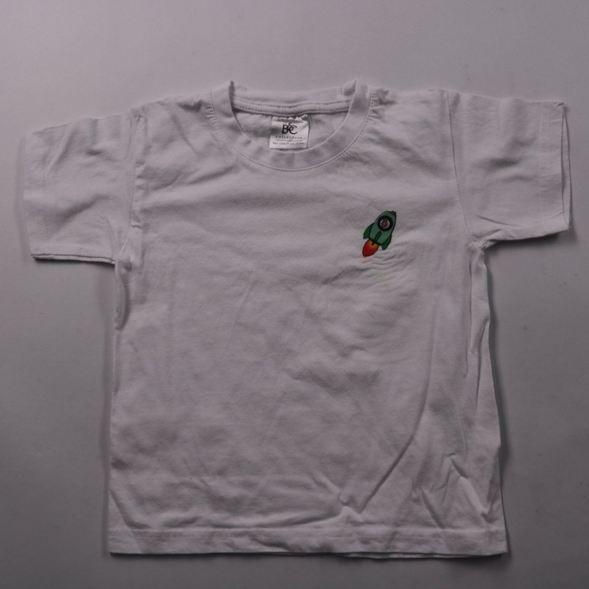Футболка B&C для мальчика белого цвета с небольшим рисунком-ракетой на груди. Подойдёт для повседневной носки, детского сада и прогулок в тёплое время или как базовый слой круглый год. Лёгкий хлопковый материал комфортный и прост в уходе.