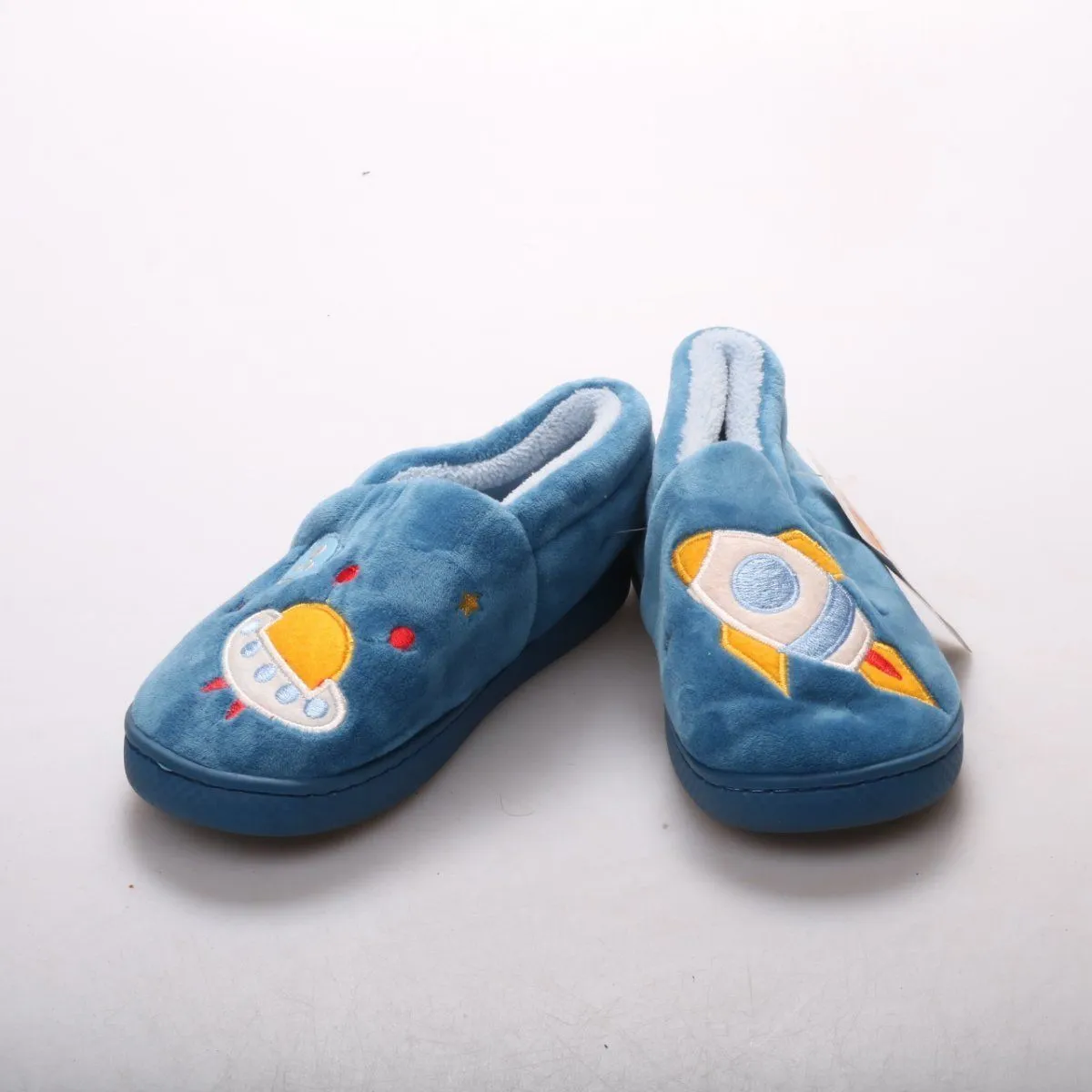 Домашние тапочки LACOFIA синего цвета с вышивкой в космической тематике. Подойдут для дома и детского сада, внутри мягкая подкладка для тепла и комфорта. Гибкая подошва с рельефом помогает меньше скользить на полу.