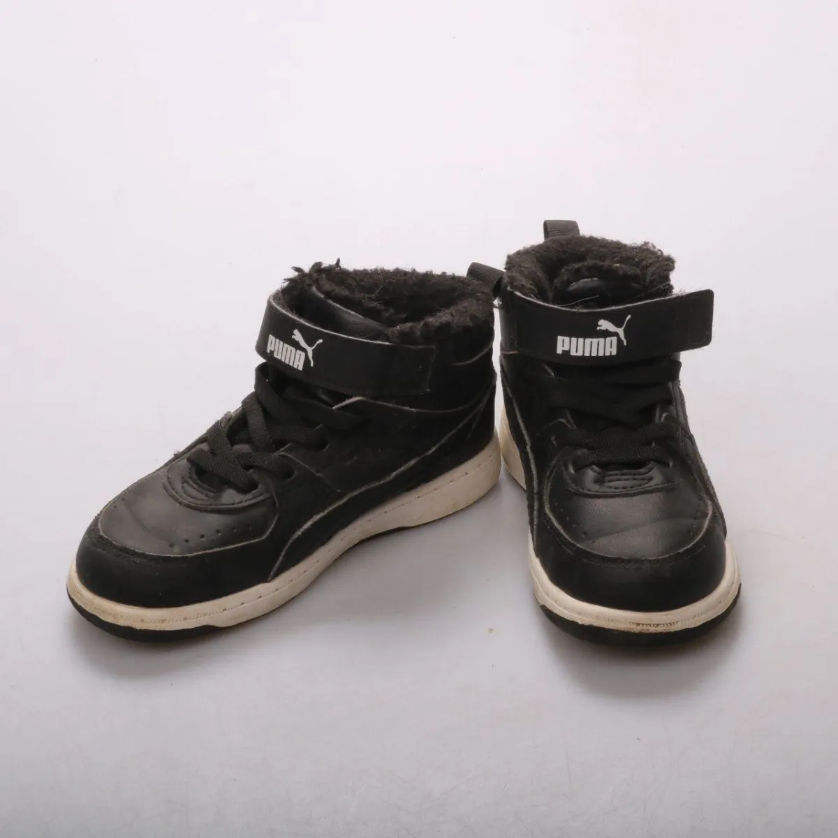 Утеплённые высокие кроссовки Puma чёрного цвета с меховой подкладкой, шнуровкой и ремешком на липучке. Подойдут для прогулок в холодную погоду осенью и зимой. Липучка помогает быстро и надёжно фиксировать обувь на ноге.
