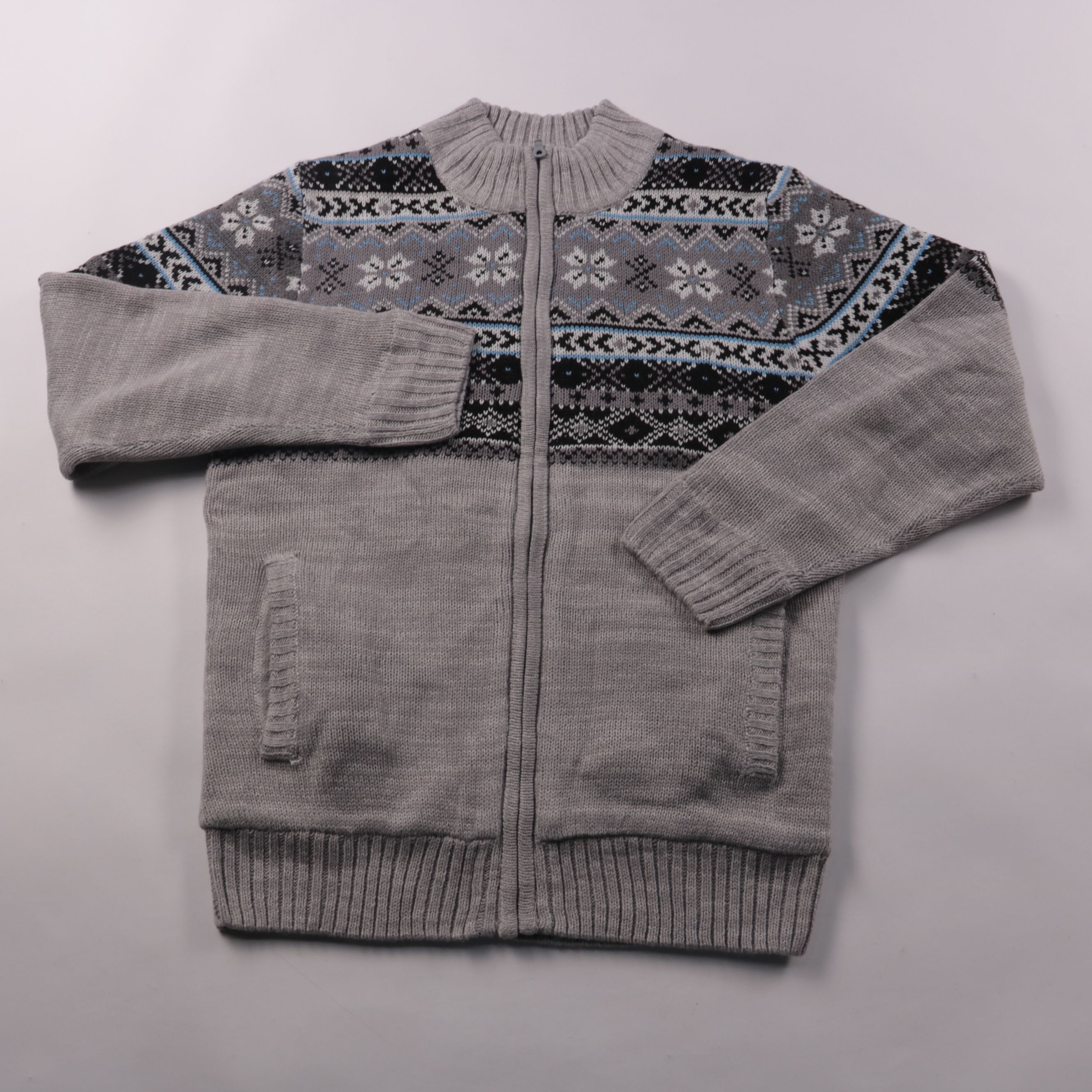 Вязаная кофта Atlas for Men на молнии, серого цвета с жаккардовым узором по верху и высоким воротником-стойкой. Подойдёт для школы и прогулок в прохладную погоду, удобно носить поверх футболки или водолазки. Практичные карманы и застёжка-молния позволя...