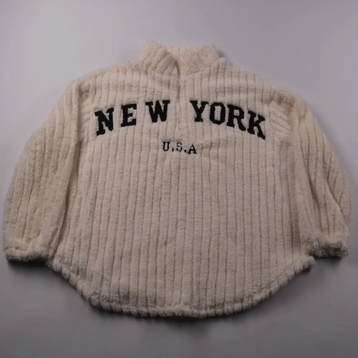 Мягкая фактурная кофта с короткой молнией и высоким воротником, спереди надпись NEW YORK. Подойдёт для школы и прогулок в прохладную погоду, удобно носить как второй слой. Ткань тёплая и приятная на ощупь, легко стирается и быстро сохнет.