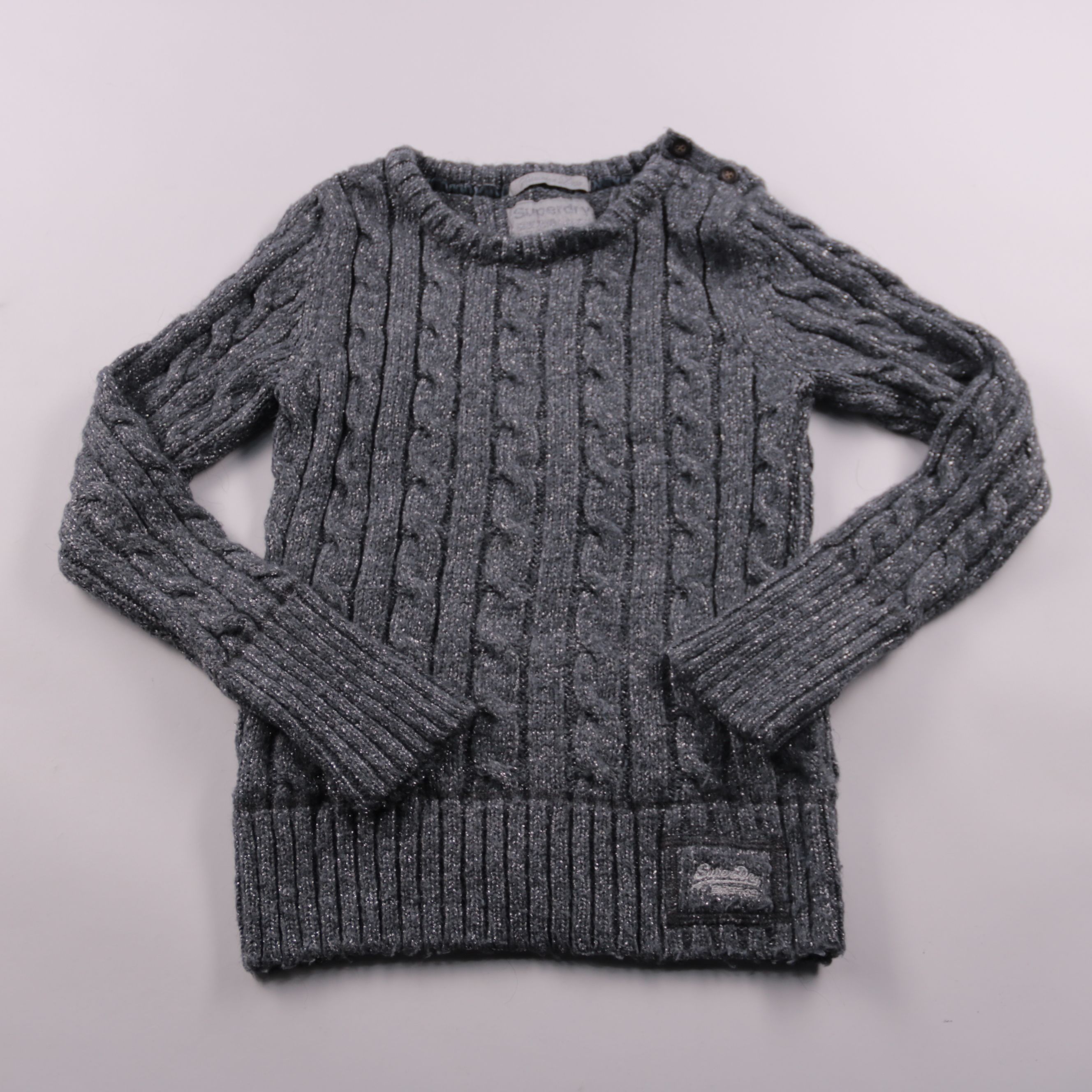 Вязаный свитер Superdry серого цвета с фактурной вязкой «косы» и пуговицами на плече. Подойдёт для школы и прогулок в прохладную погоду, хорошо сочетается с джинсами и брюками. Плотная вязка помогает сохранять тепло и комфортно сидит под курткой.