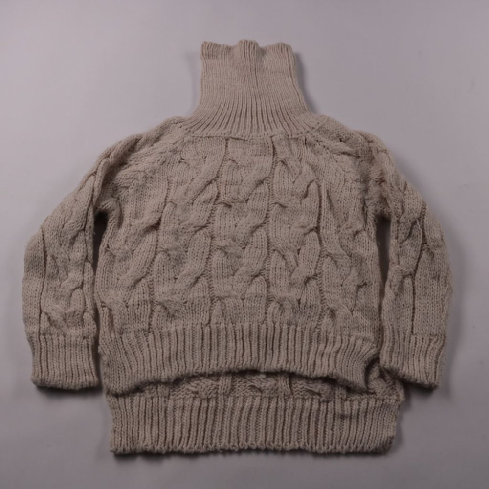 Вязаный свитер с высоким воротником-гольфом и рельефным узором «косы», без заметного бренда. Подойдёт для прохладной погоды и зимних прогулок, хорошо смотрится с джинсами или утеплёнными брюками. Тёплая плотная вязка и широкие резинки на манжетах и по ...