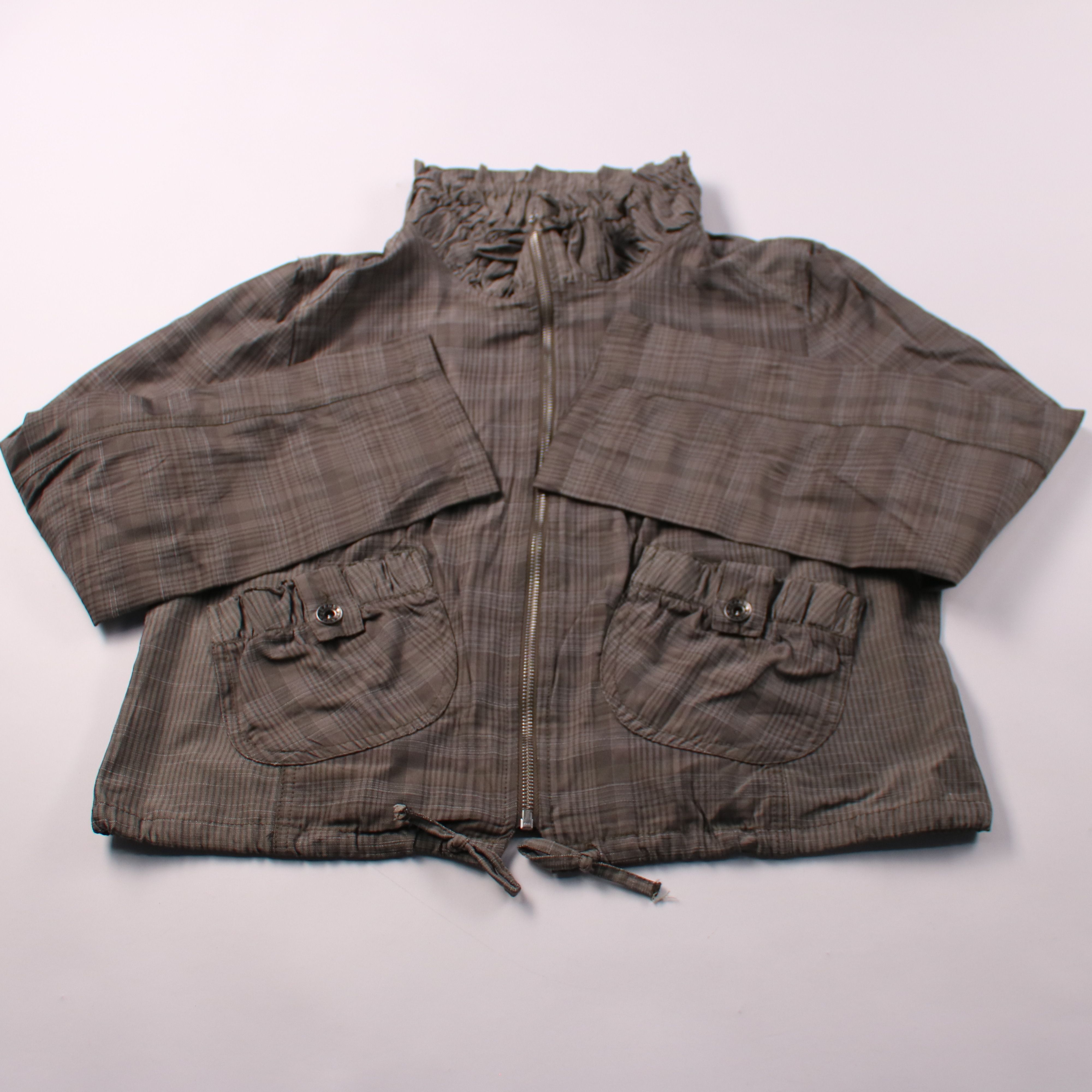 Детская куртка на молнии в клетку, с высоким воротником и двумя накладными карманами спереди. Подойдёт для прогулок в прохладную погоду весной и осенью. Лёгкая и удобная, есть утяжки по низу для регулировки посадки.