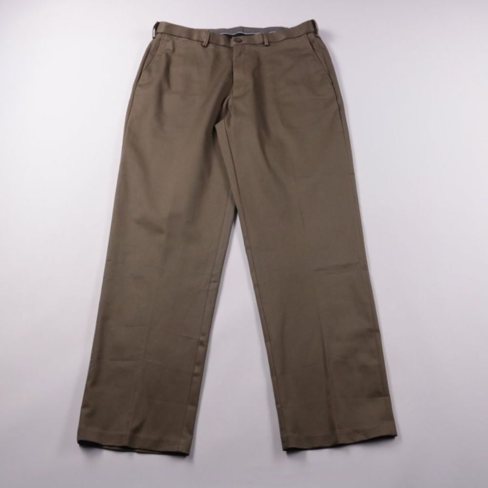Мужские брюки Haggar Classic Fit Premium No Iron Khaki в базовом бежево-коричневом оттенке. Подойдут для офиса и повседневной носки, ткань почти не мнётся и выглядит аккуратно. В составе есть эластан — сидят комфортно и не сковывают движения.