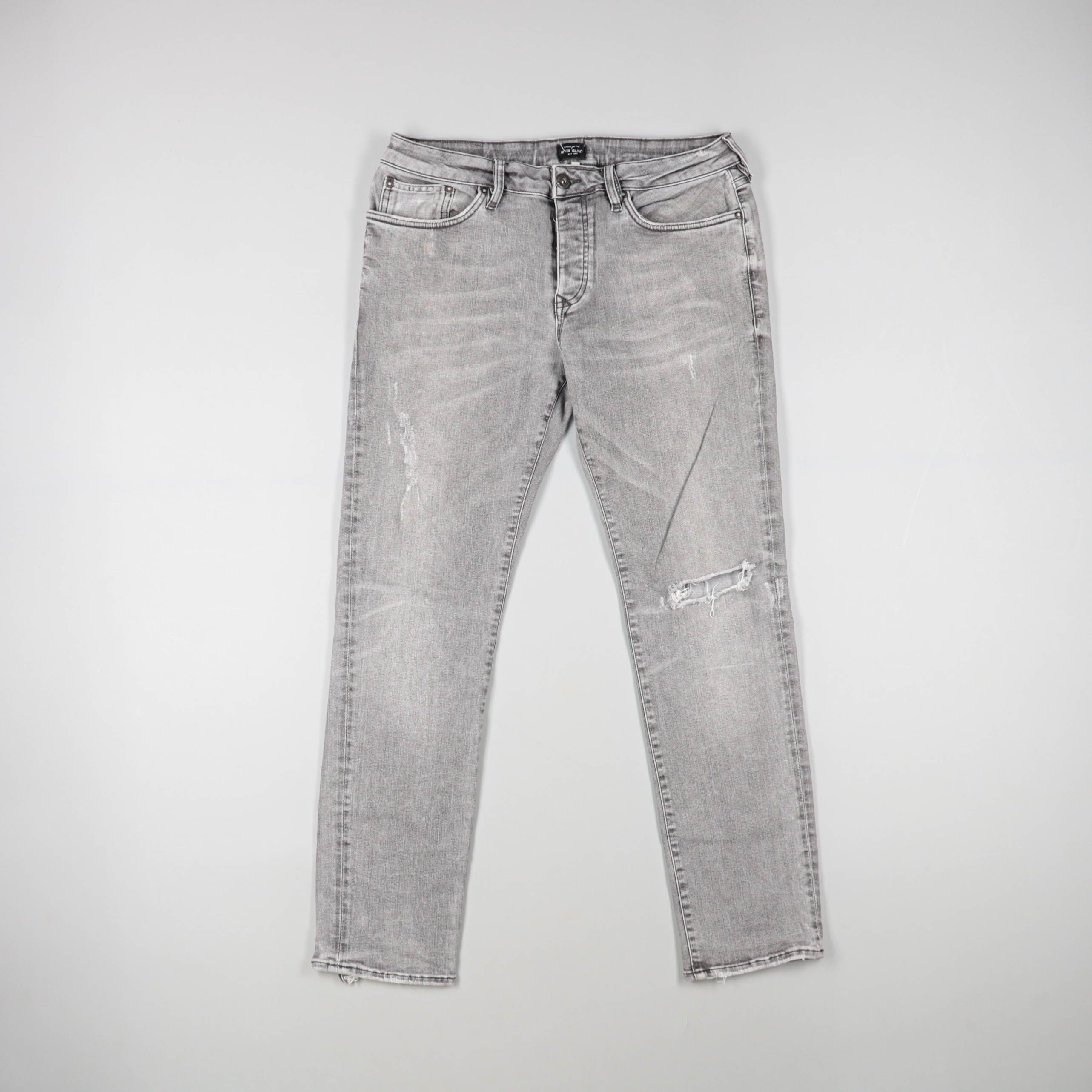 Мужские серые джинсы с эффектом потертостей и декоративными разрывами на колене. Подойдут для повседневных городских образов с футболкой, худи или рубашкой. Плотный деним держит форму и комфортно носится каждый день.