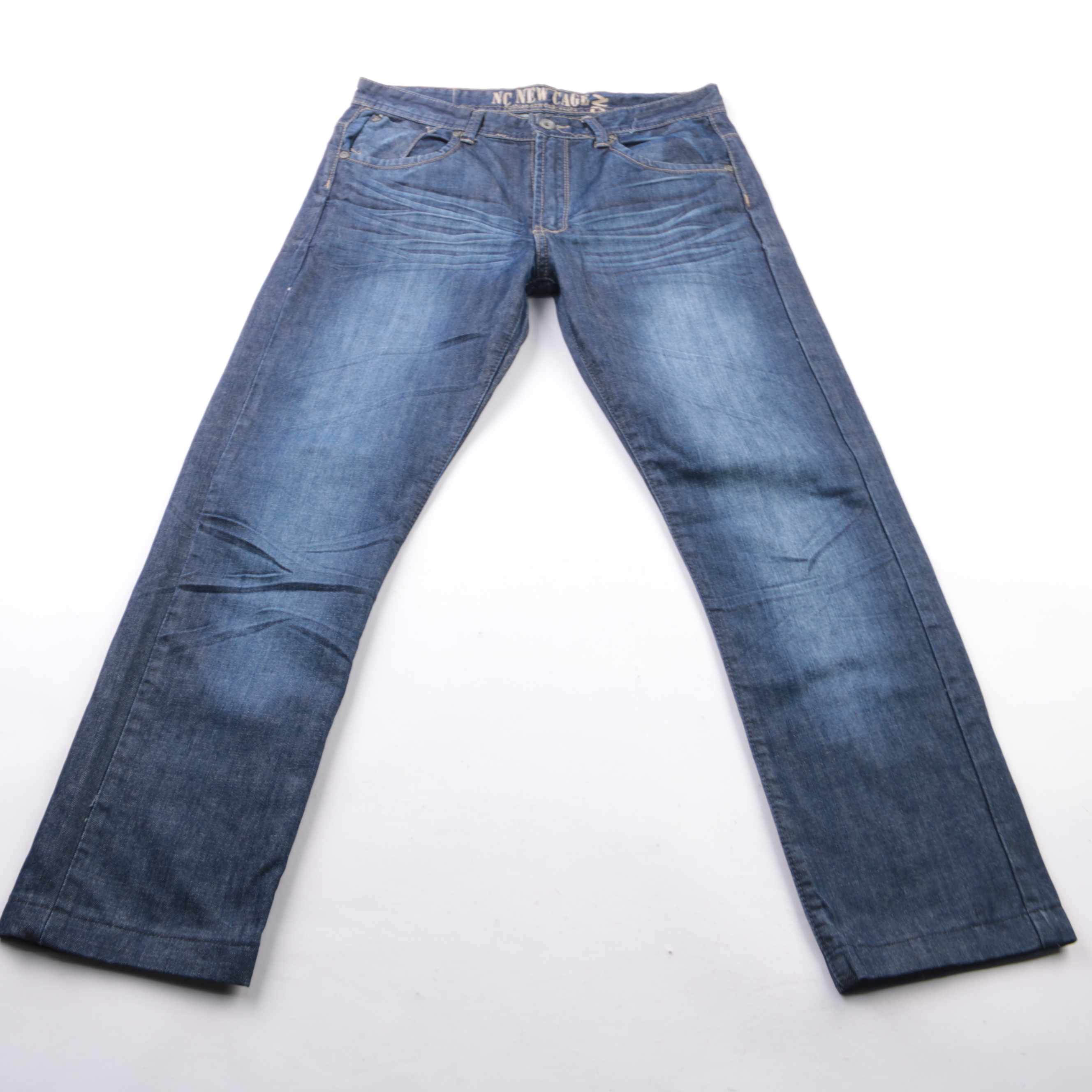 Мужские джинсы Nc New Cage из денима синего цвета с лёгкими потёртостями. Подойдут для повседневных образов в городе и на работу с нестрогим дресс-кодом. Плотный хлопковый материал хорошо держит форму и комфортен в носке.