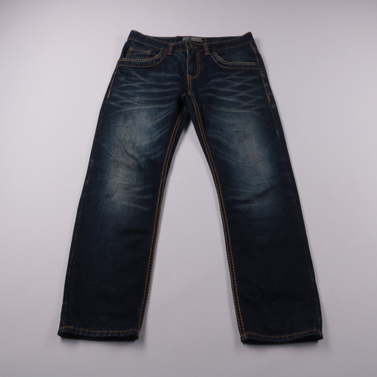 Мужские джинсы Savvy из тёмно-синего денима с контрастной строчкой и лёгкими потертостями. Подойдут для повседневной носки и городских образов в любое время года. Практичный плотный материал хорошо держит форму и не требует сложного ухода.
