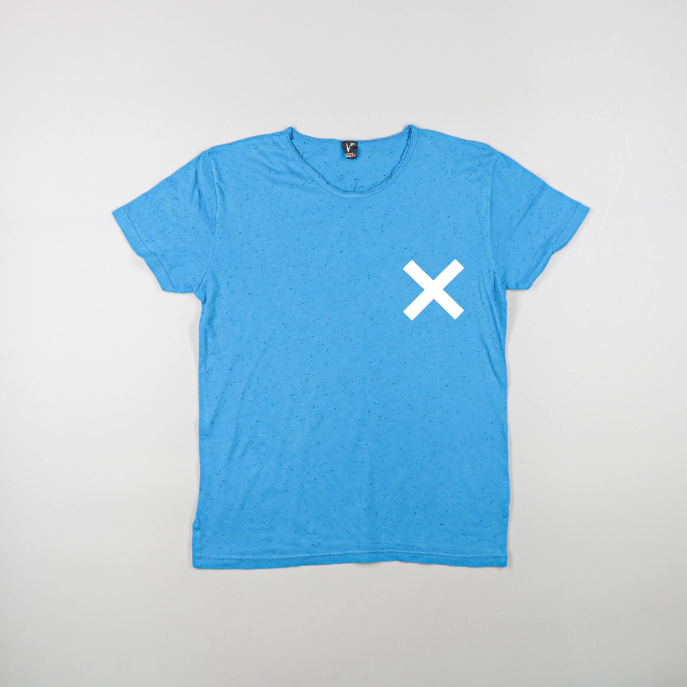 Мужская футболка Vreplacc голубого цвета с крапчатой фактурой и небольшим логотипом на спине. Подойдёт для лета и повседневных образов, легко сочетается с джинсами или шортами. Тонкий трикотаж комфортно носить в жару и удобно брать в поездки.