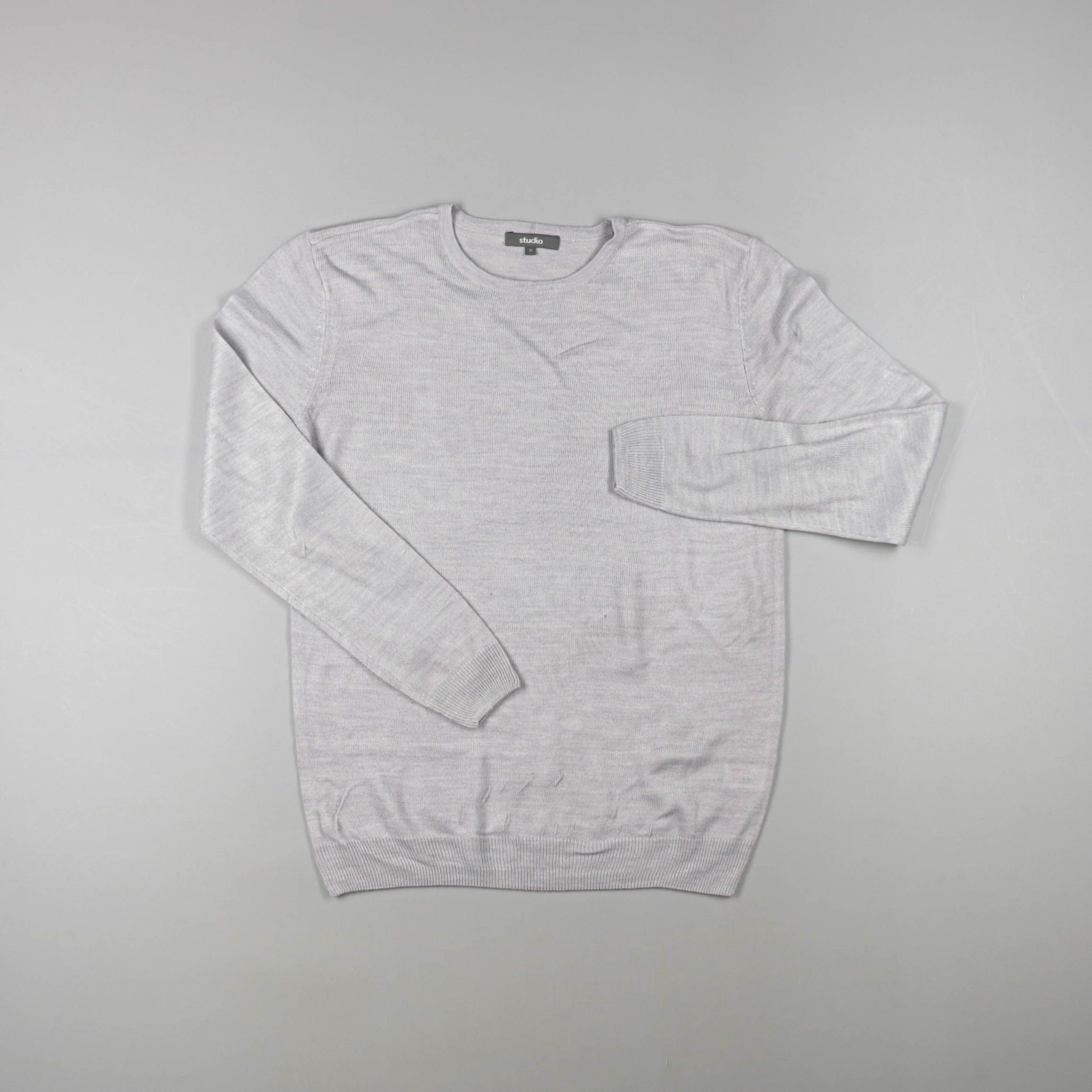 Мужской джемпер Studio светло-серого меланжевого цвета с круглым вырезом и длинным рукавом. Подойдёт для повседневной носки и офиса в прохладную погоду, легко сочетается с джинсами и брюками. Практичный плюс — базовый цвет и трикотажные манжеты/низ, ко...