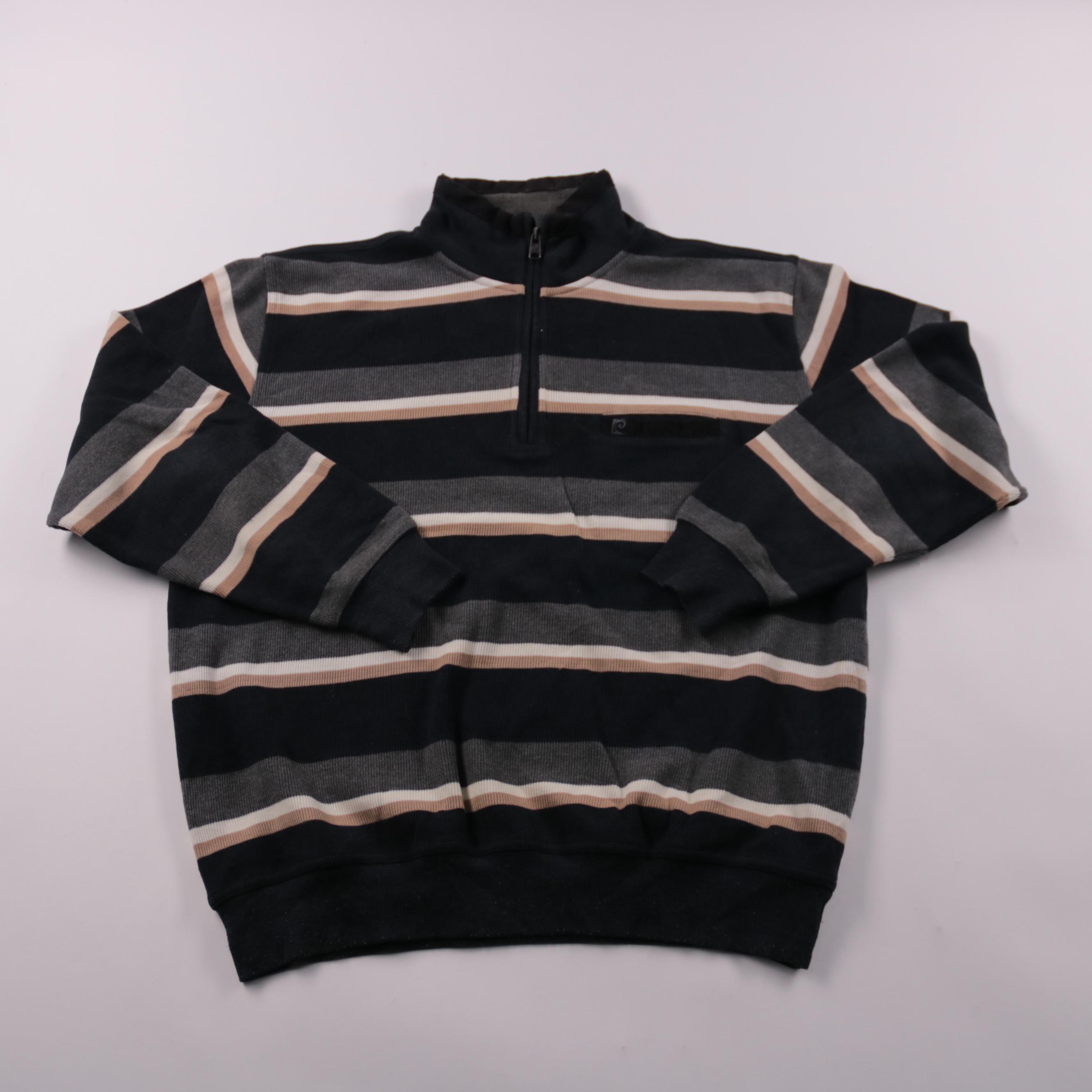 Мужской джемпер Pierre Cardin French Heritage в полоску, с воротником-стойкой и короткой молнией. Подойдёт для повседневной носки в прохладную погоду и как слой под куртку. Трикотаж с хлопком в составе комфортный и хорошо дышит.