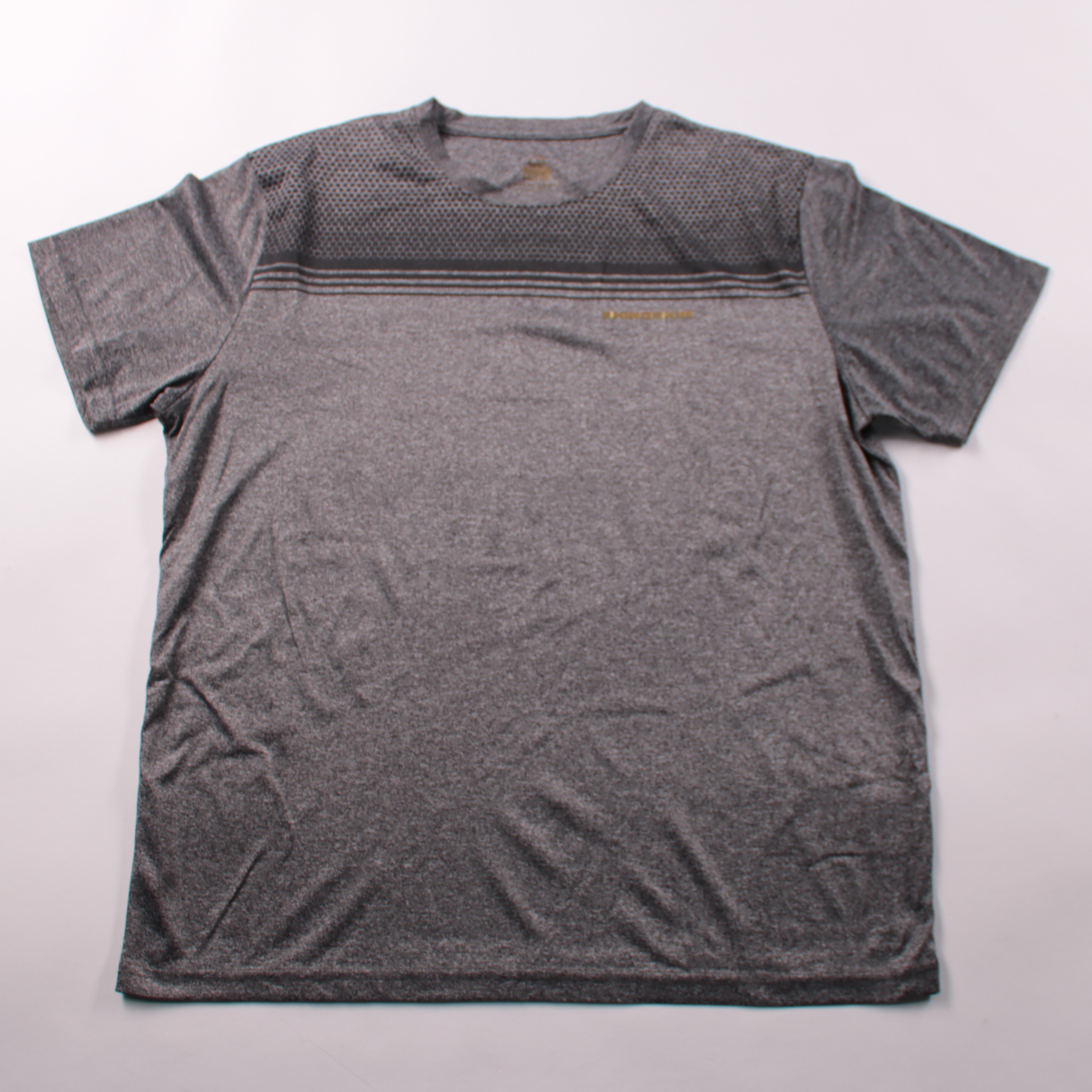 Мужская спортивная футболка Rhino Skin серого цвета с коротким рукавом и вставкой/полосой на груди. Подойдёт для тренировок, бега и активного отдыха благодаря лёгкой синтетической ткани. Практична в носке: быстро сохнет и проста в уходе.