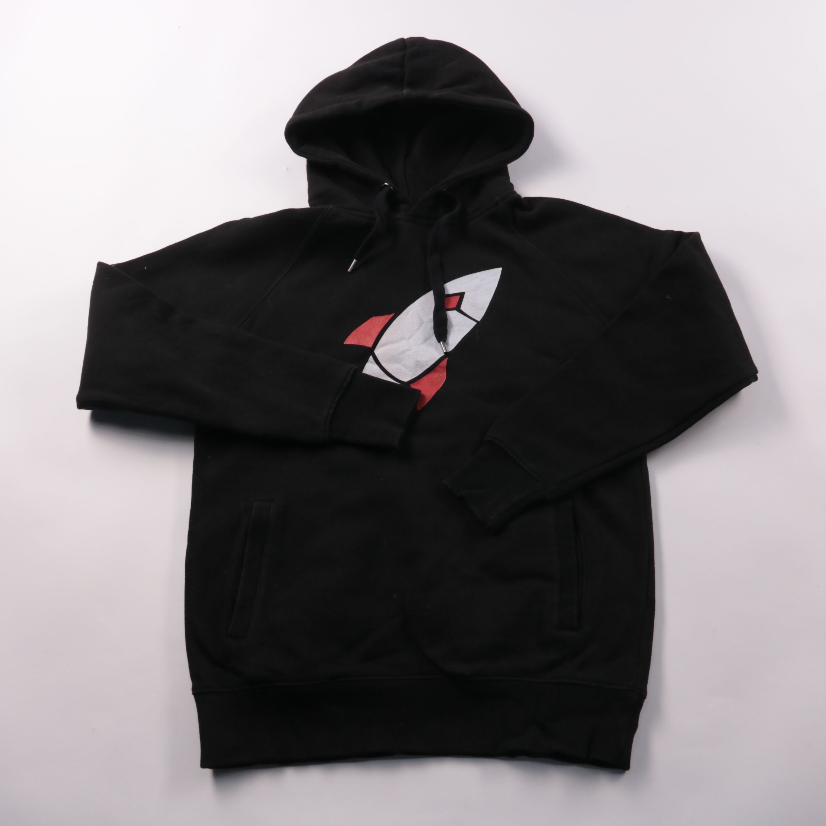 Чёрное худи с капюшоном и карманом-кенгуру, с контрастным бело-красным принтом на груди. Подойдёт для повседневной носки в прохладную погоду и для прогулок. Мягкая внутренняя сторона из футера делает модель тёплой и комфортной.