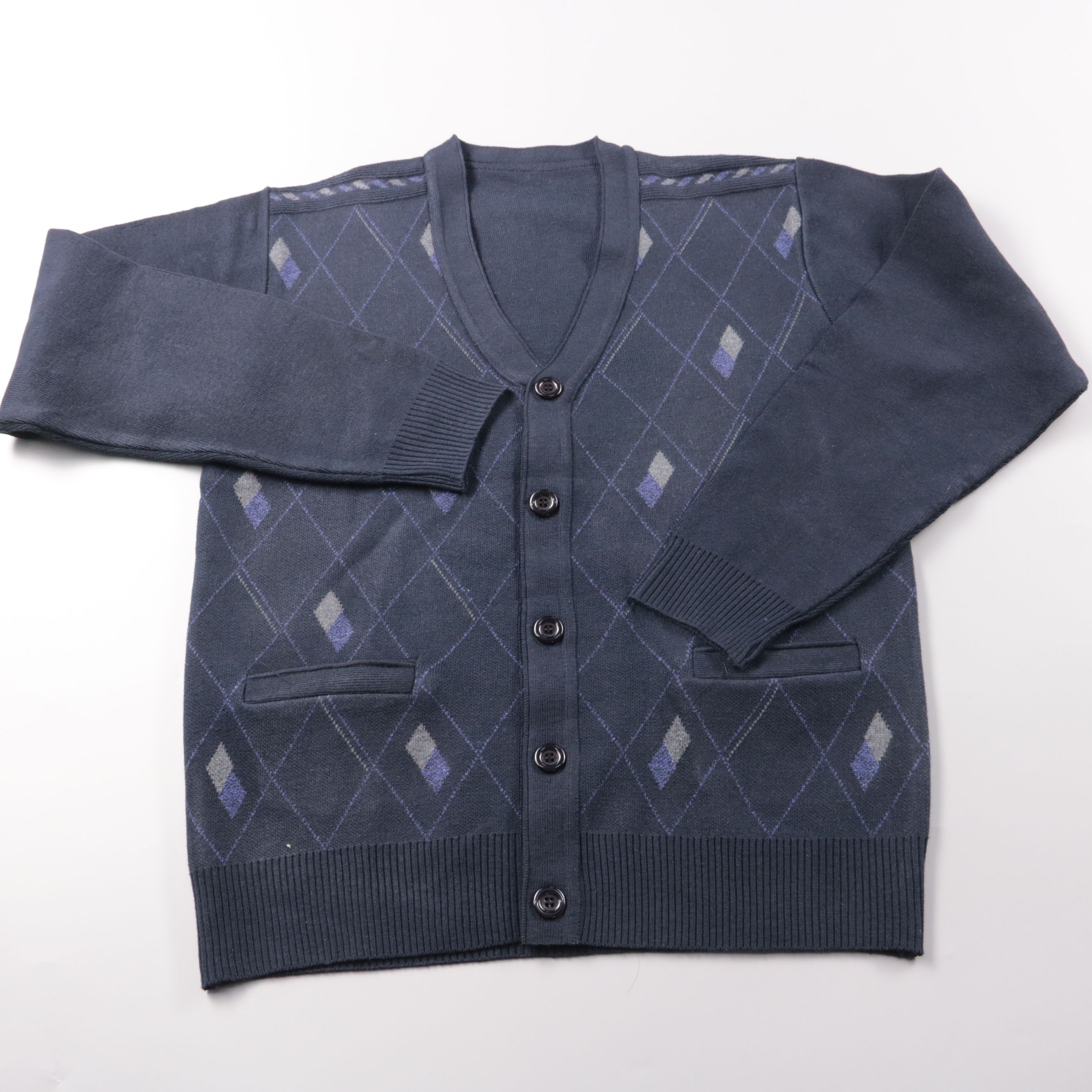 Мужской кардиган на пуговицах с V‑образным вырезом и узором «аргайл» в синем цвете. Подойдёт для офиса и повседневных образов, удобно носить поверх футболки или рубашки. Практичен за счёт эластичной манжеты и наличия карманов.
