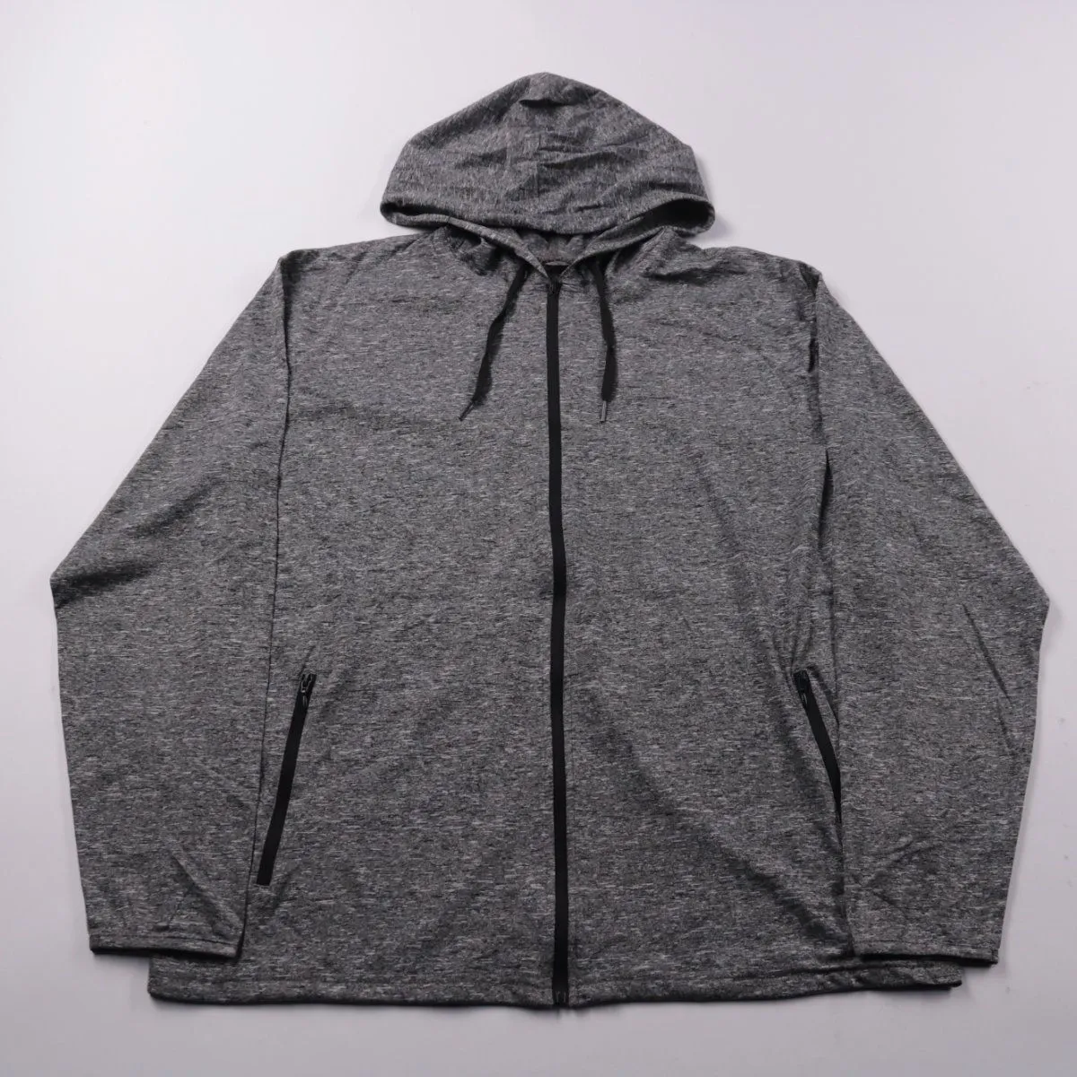 Мужское худи на молнии с капюшоном, без указанного бренда, выполнено из 100% полиэстера. Подойдёт для прогулок и повседневной носки в прохладную погоду, есть боковые карманы на молнии. Лёгкий материал быстро сохнет и удобен в уходе.