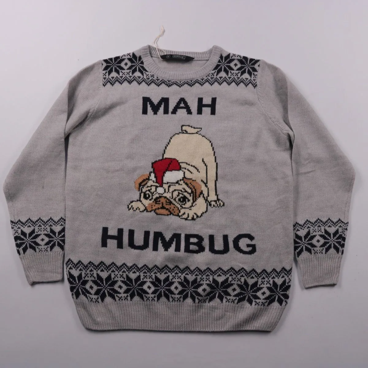 Мужской свитер Avenue серого цвета с новогодним жаккардовым узором и принтом с мопсом «MAH HUMBUG». Подойдёт для зимних прогулок и праздничных встреч, хорошо смотрится с джинсами и чиносами. Практичный плюс — плотная акриловая вязка, прост в уходе и быстро сохнет.