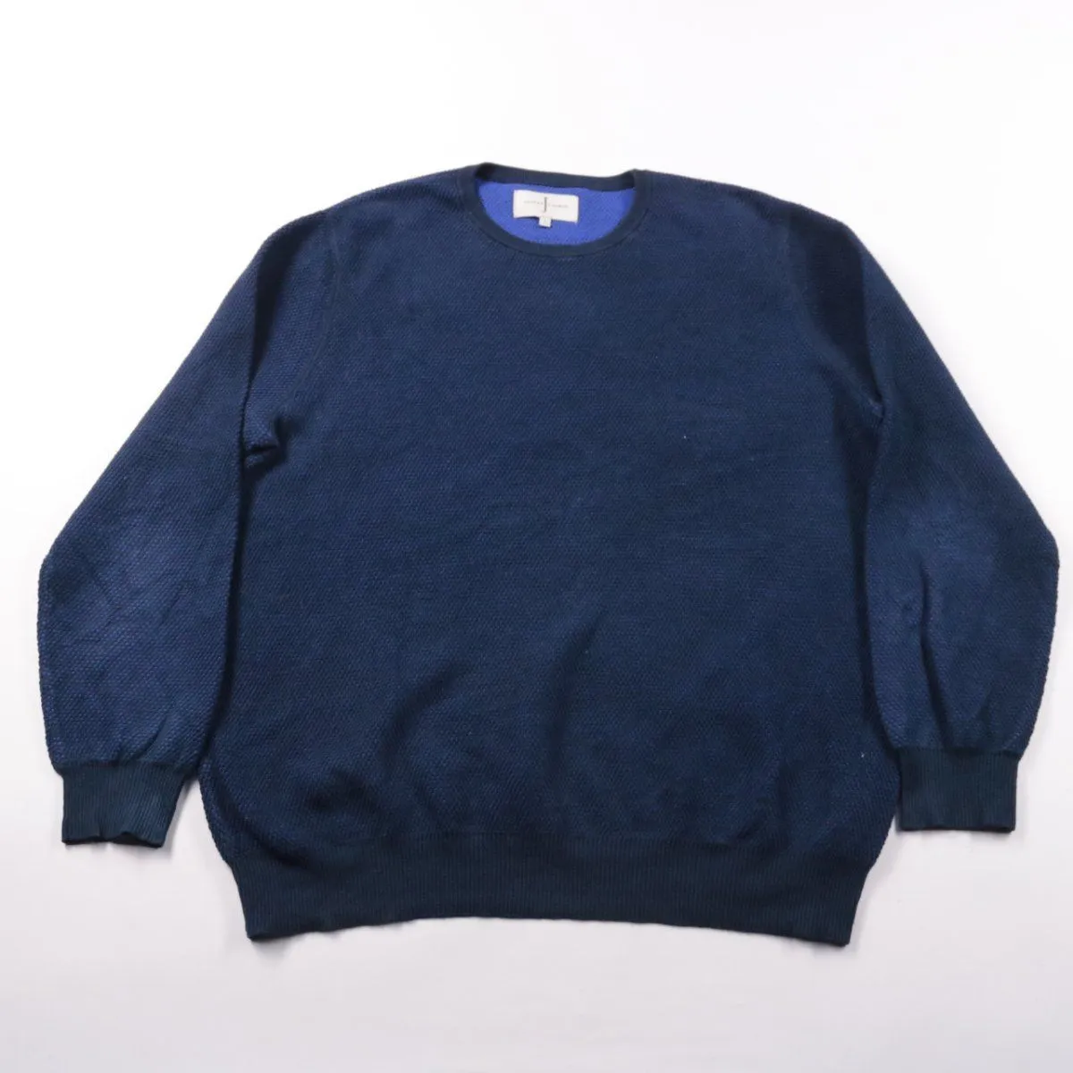 Мужской джемпер Jasper Conran тёмно-синего цвета с круглым вырезом и фактурной вязкой. Подойдёт для повседневной носки и офиса в прохладную погоду, легко сочетается с джинсами и брюками. 100% хлопок — дышит и комфортен в носке.