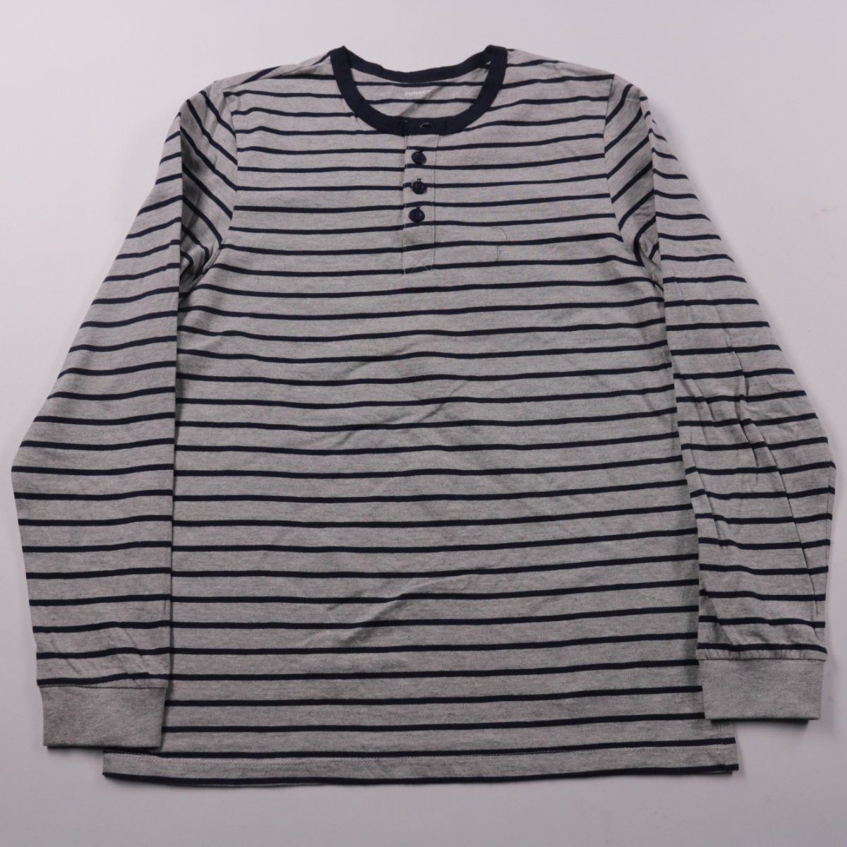 Мужской лонгслив Dunnes Stores в серо-синюю полоску с планкой на пуговицах (хенли). Подойдёт для повседневной носки и как базовый слой в прохладную погоду. Практичный трикотаж из хлопка с добавлением вискозы приятен к телу и прост в уходе.