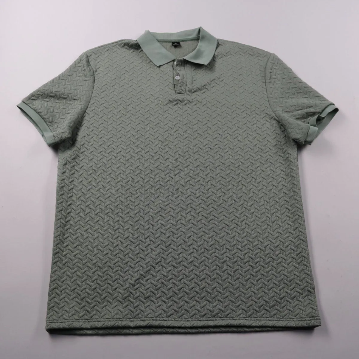 Мужское поло с коротким рукавом и фактурной тканью «ёлочка» в спокойном зелёном оттенке. Подойдёт для повседневной носки и офиса с нестрогим дресс-кодом, хорошо сочетается с джинсами и чиносами. Практичный синтетический состав почти не мнётся и быстро сохнет.