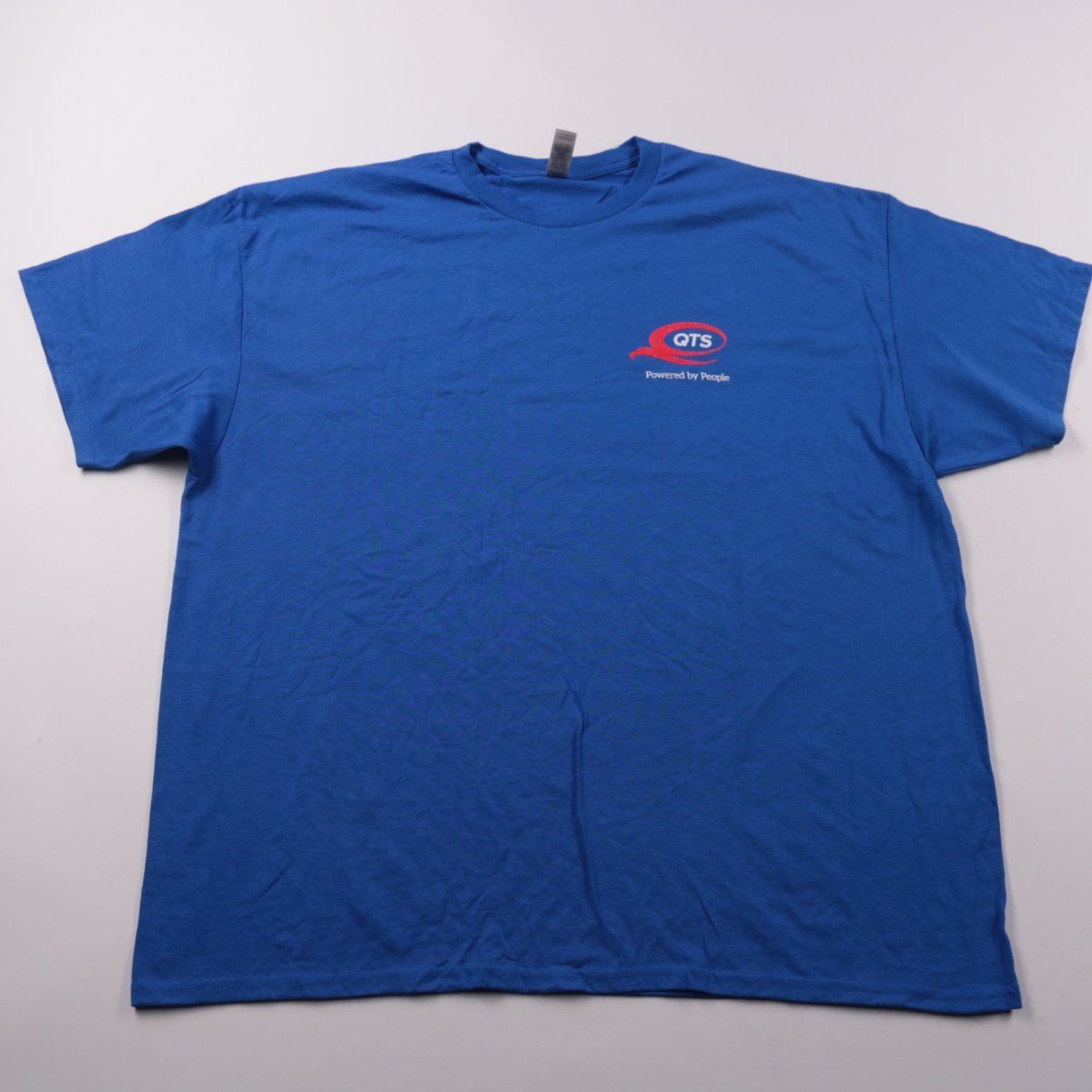 Мужская футболка Gildan DryBlend синего цвета с принтами спереди и на спине. Подойдёт для повседневной носки, дома или как рабочая/промо-форма. Смесовая ткань (хлопок/полиэстер) практична в уходе и меньше мнётся.