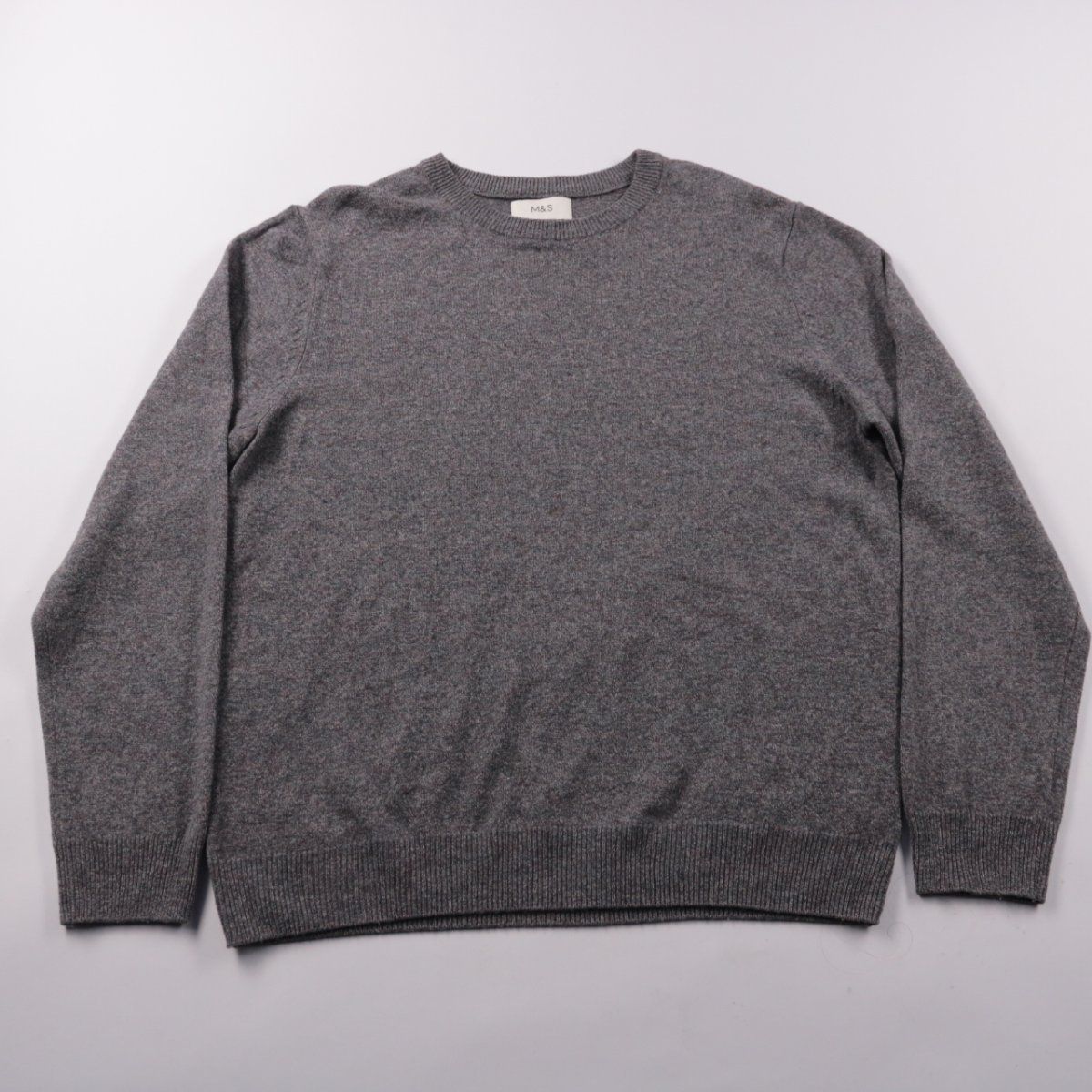 Мужской джемпер M&S из тонкой шерсти ягнёнка (extra fine lambswool), серого меланжевого цвета, с круглым вырезом. Подойдёт для офиса и повседневных образов в прохладную погоду, хорошо смотрится под рубашку или куртку. Практичное преимущество — натуральная шерсть тёплая и при этом «дышит».