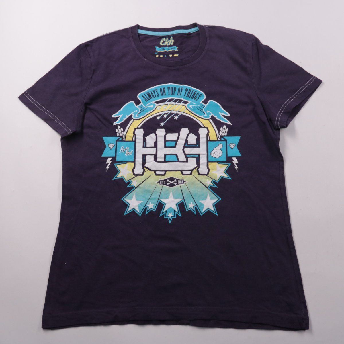 Мужская футболка CKH тёмно-синего цвета с крупным принтом на груди. Подойдёт для повседневной носки и летних образов с джинсами или шортами. Мягкий трикотаж и классический крой делают её удобной на каждый день.