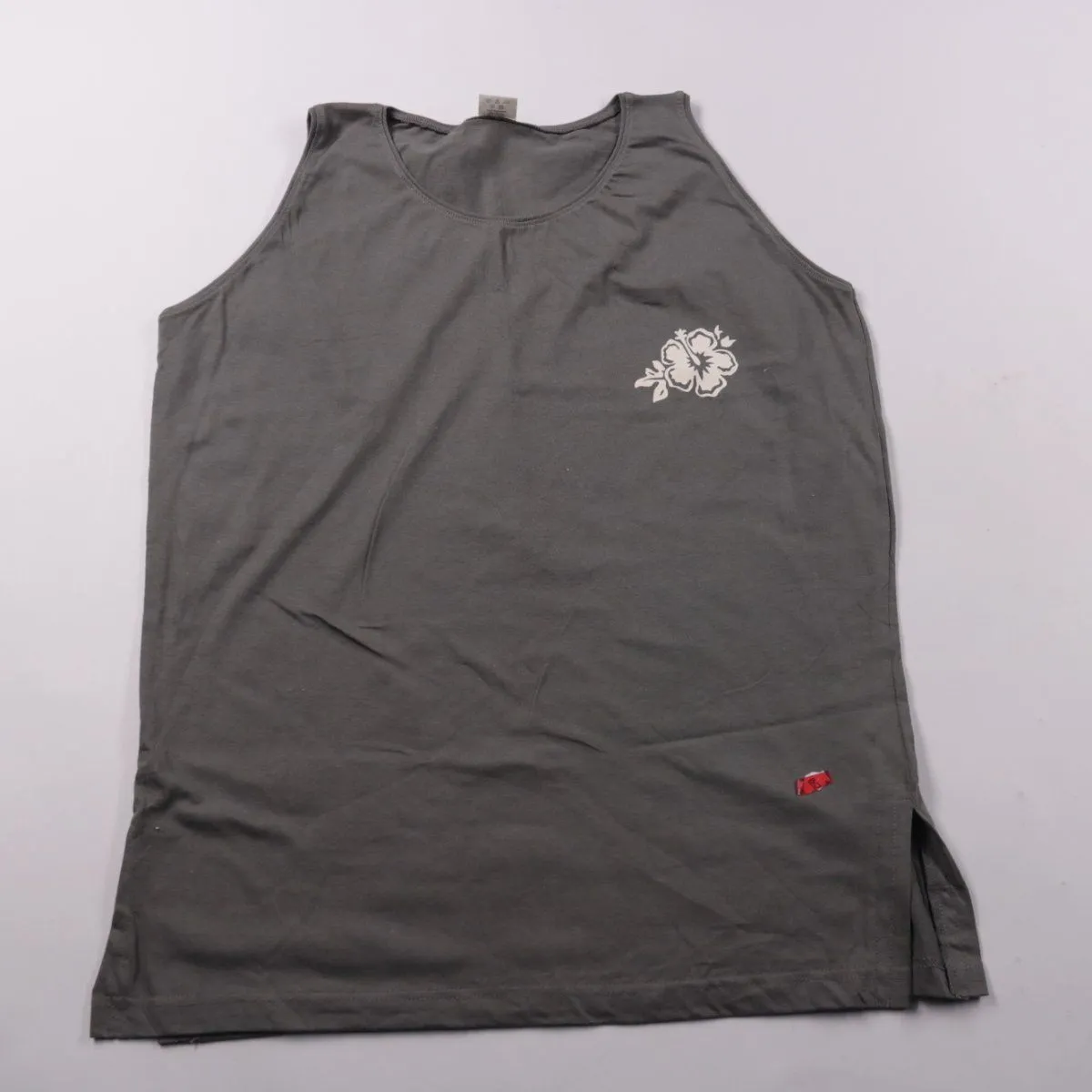 Мужская майка без рукавов из 100% хлопка, бренд не указан. Выполнена в тёмно-сером цвете с небольшим белым принтом цветка на груди, подойдёт для лета, спорта и повседневной носки. Дышащий хлопок комфортен в жару и легко стирается.