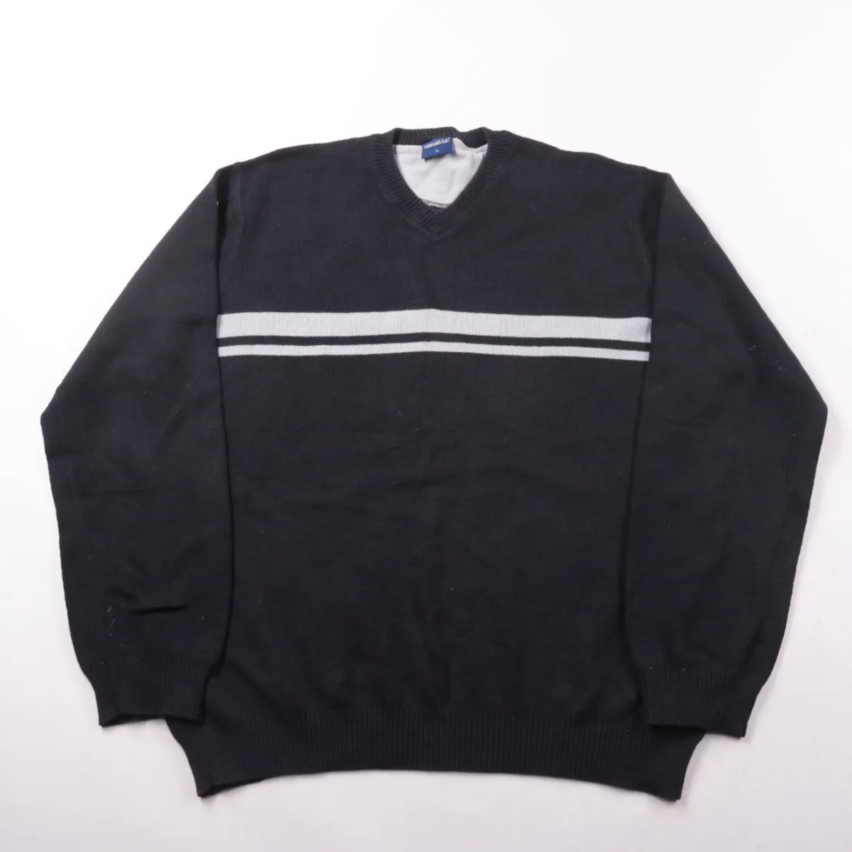 Мужской джемпер casualclub с V-образным вырезом и горизонтальной контрастной полосой на груди. Подойдёт для повседневной носки и офиса в прохладную погоду, хорошо сочетается с джинсами и брюками. Хлопковый материал дышит и комфортен при носке.
