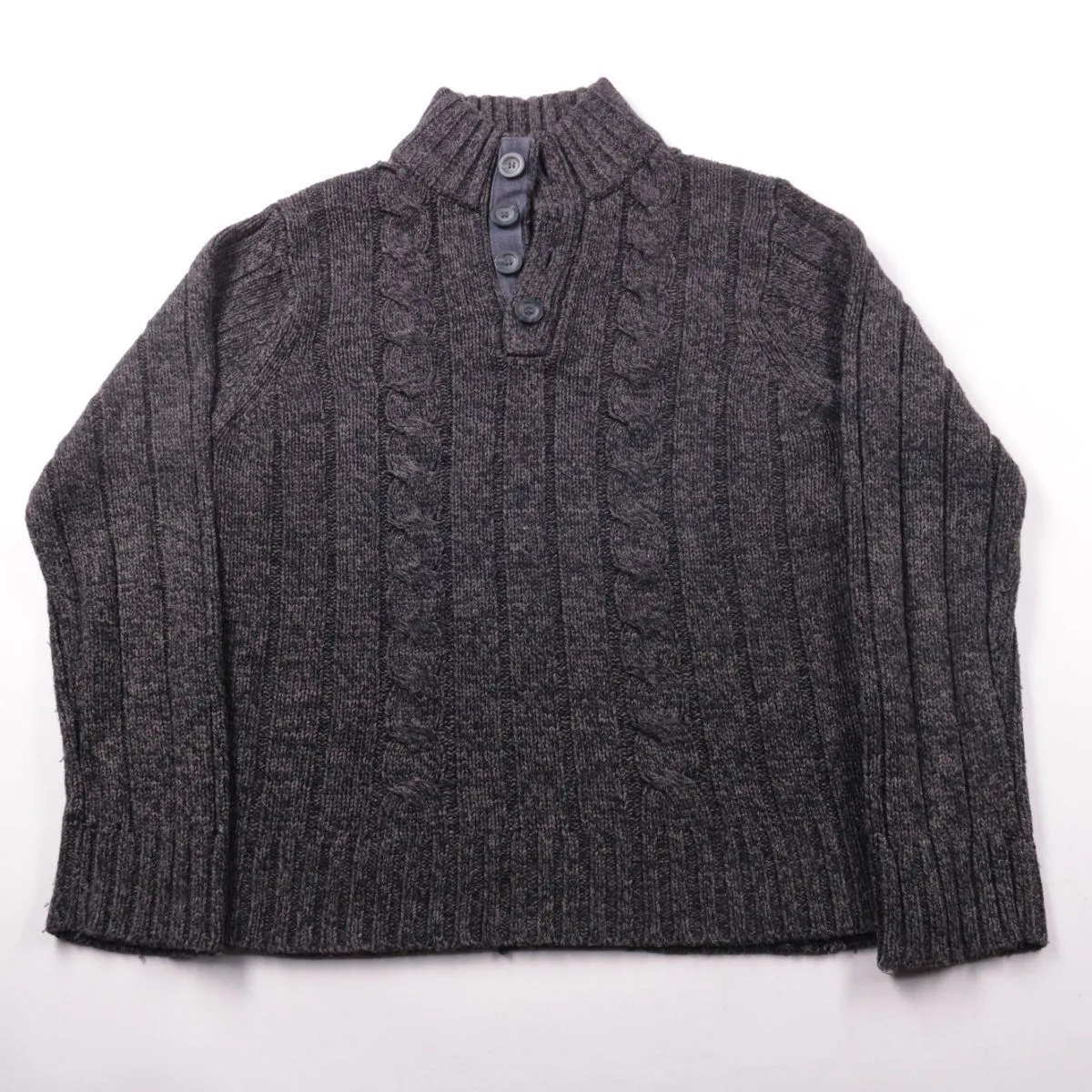 Мужской вязаный свитер George тёмно-серого меланжа с высоким воротником на пуговицах и рельефным узором. Подойдёт для повседневной носки в прохладную погоду и как средний слой под куртку. Акриловая пряжа практична в уходе и быстро сохнет.