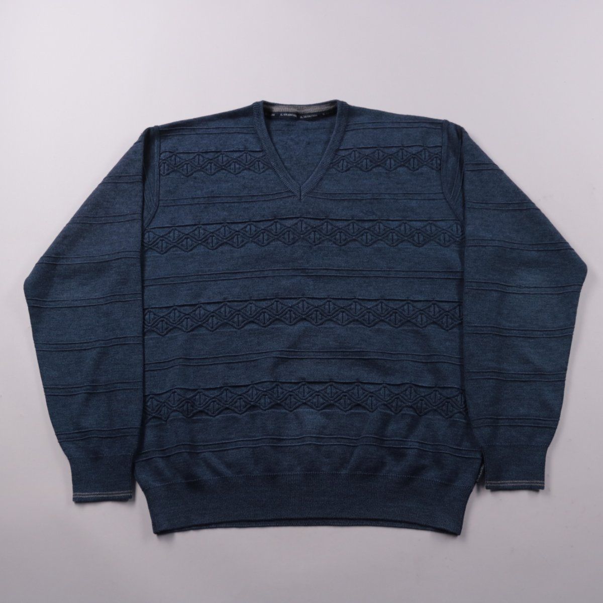 Мужской вязаный джемпер с V-образным вырезом и фактурными горизонтальными полосами. Подойдёт для повседневной носки в офисе или на прогулках в прохладную погоду. Смесь шерсти и акрила делает его тёплым и менее капризным в уходе.