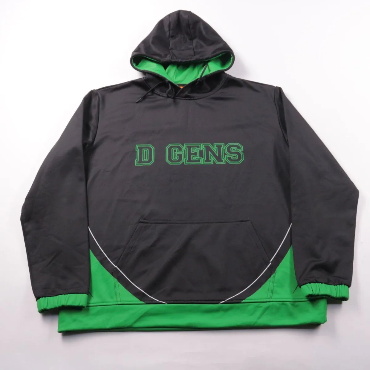 Худи OZTT в чёрно-зелёной расцветке с принтом «D GENS» и карманом-кенгуру. Подойдёт для повседневной носки и спорта в прохладную погоду благодаря капюшону и длинным рукавам. Практичный плюс — материал из 100% полиэстера быстро сохнет и прост в уходе.