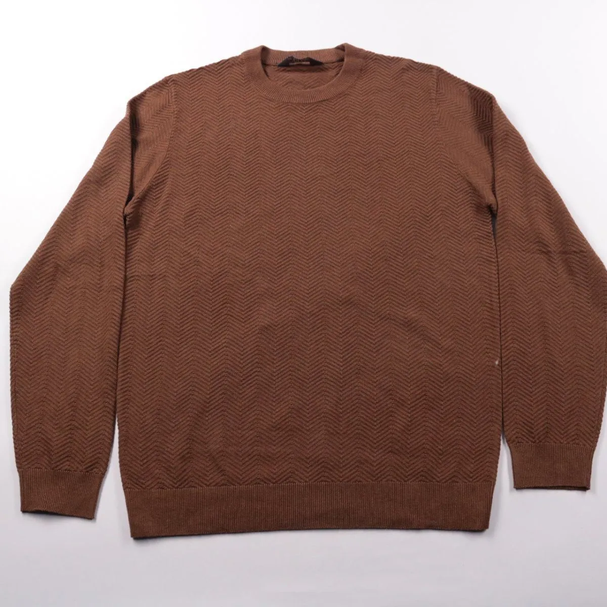 Мужской джемпер Primark коричневого цвета с фактурным узором «ёлочка» и круглым вырезом. Подойдёт для повседневной носки и офисных образов в прохладную погоду, хорошо сочетается с джинсами и брюками. Практичный плюс — мягкий смесовый материал, который меньше мнётся и проще в уходе.