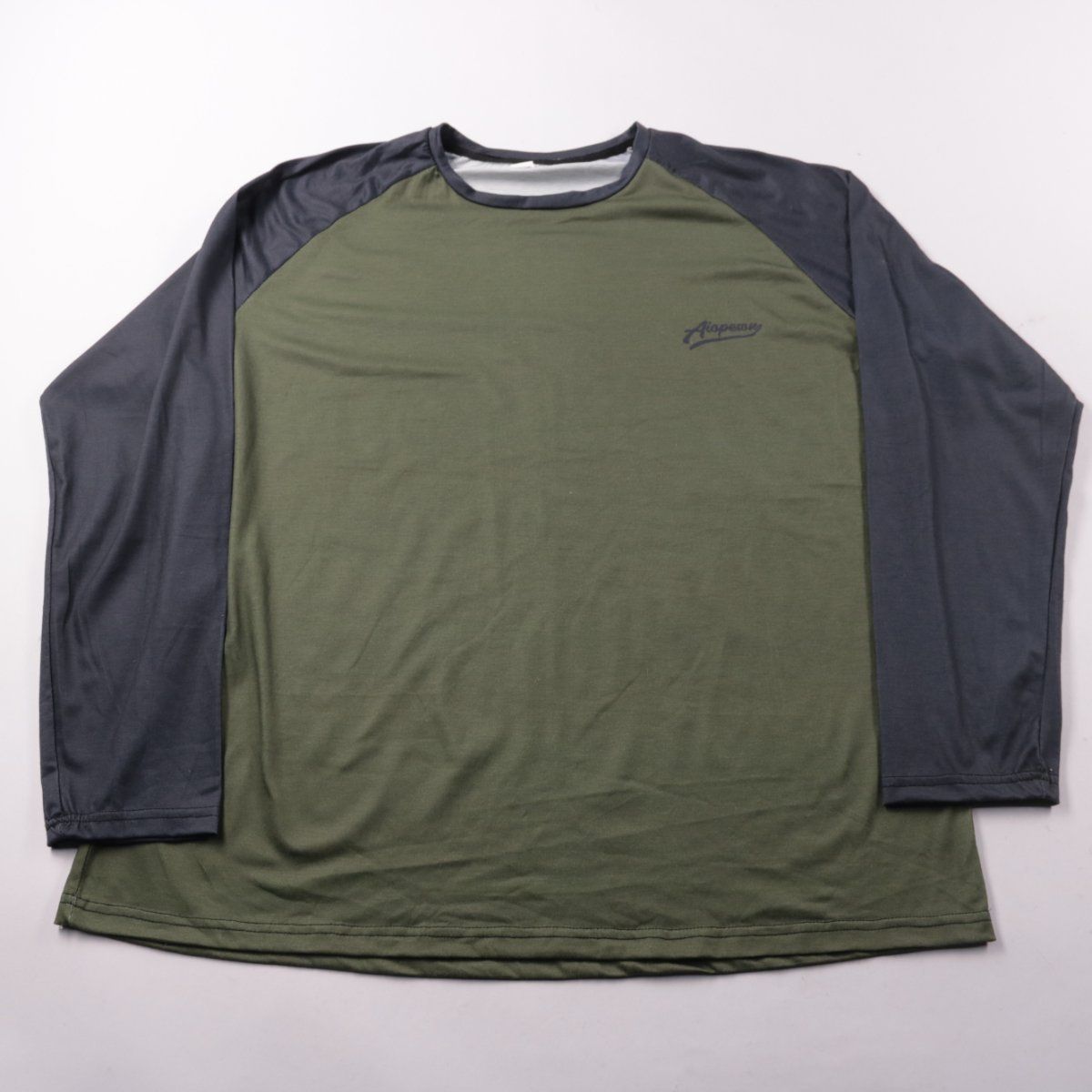 Мужской лонгслив с рукавом реглан, двухцветный: оливковый корпус и тёмные рукава. Подойдёт для повседневной носки и как базовый слой в прохладную погоду. Практичен тем, что не стесняет движений и легко сочетать с джинсами или спортивными брюками.