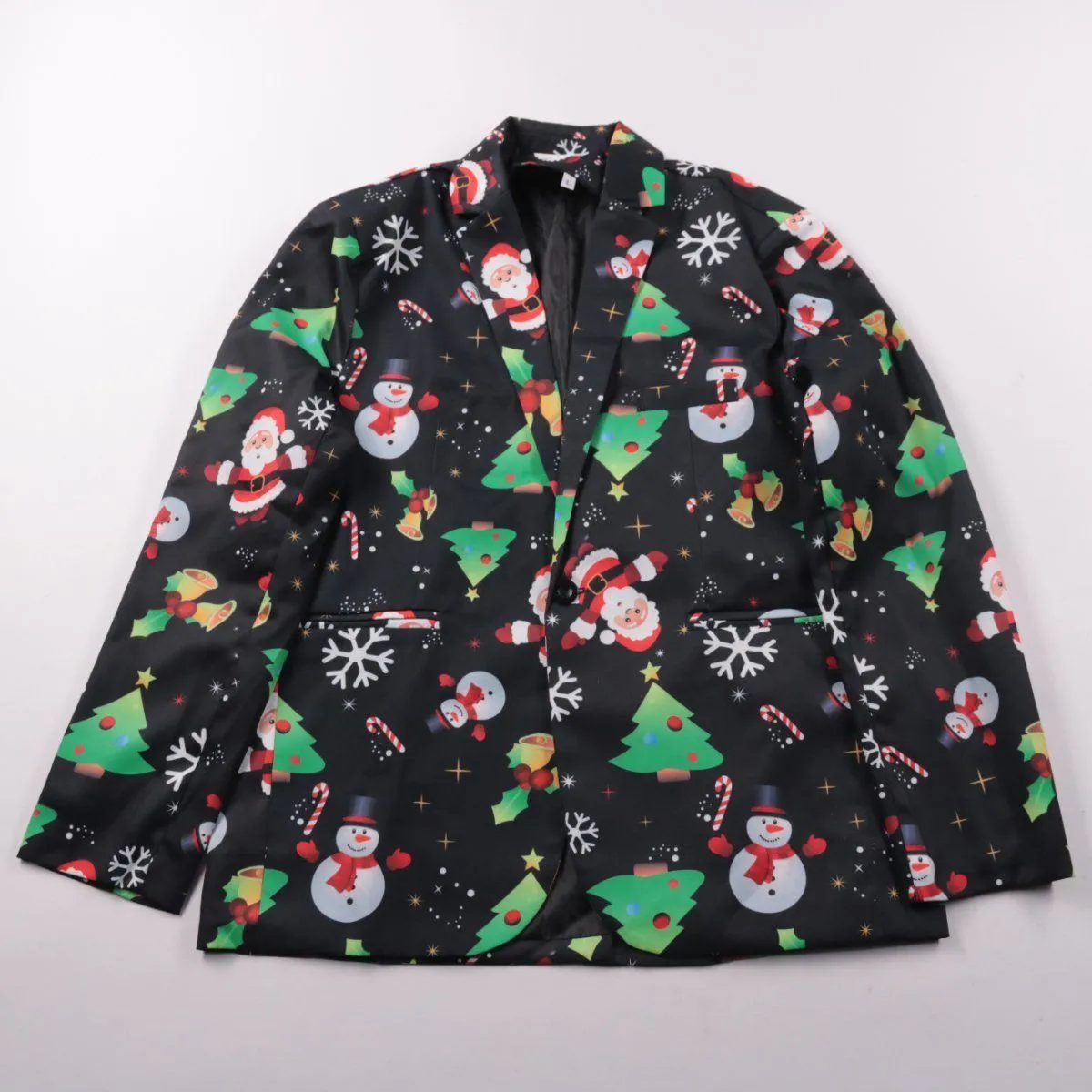 Мужской пиджак (бренд не указан) с новогодним принтом на чёрной основе — ёлки, снеговики и Санта. Подойдёт для вечеринок, корпоративов и тематических мероприятий. Практичен тем, что лёгкий и не мнётся так заметно благодаря полиэстеру.