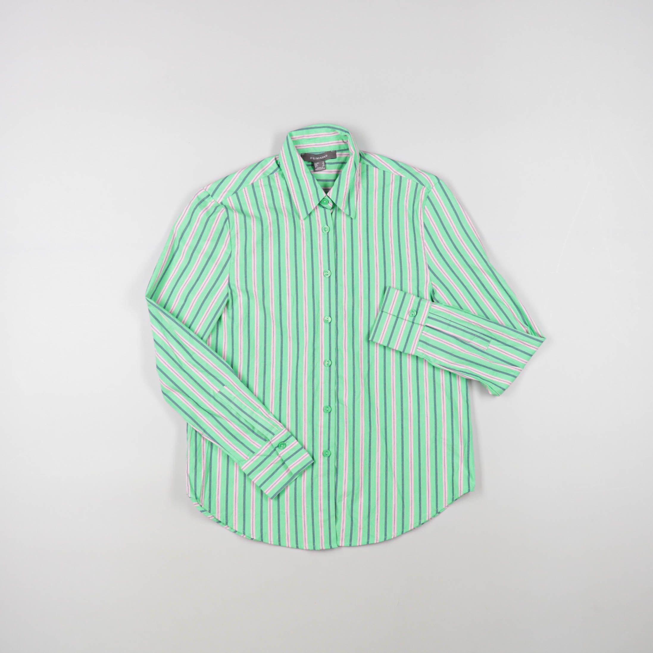 Мужская рубашка Primark в зелёную полоску, на пуговицах, с длинным рукавом и классическим воротником. Подойдёт для офиса и повседневных образов с джинсами или брюками. Полосатый принт выглядит аккуратно и меньше мнётся визуально в течение дня.